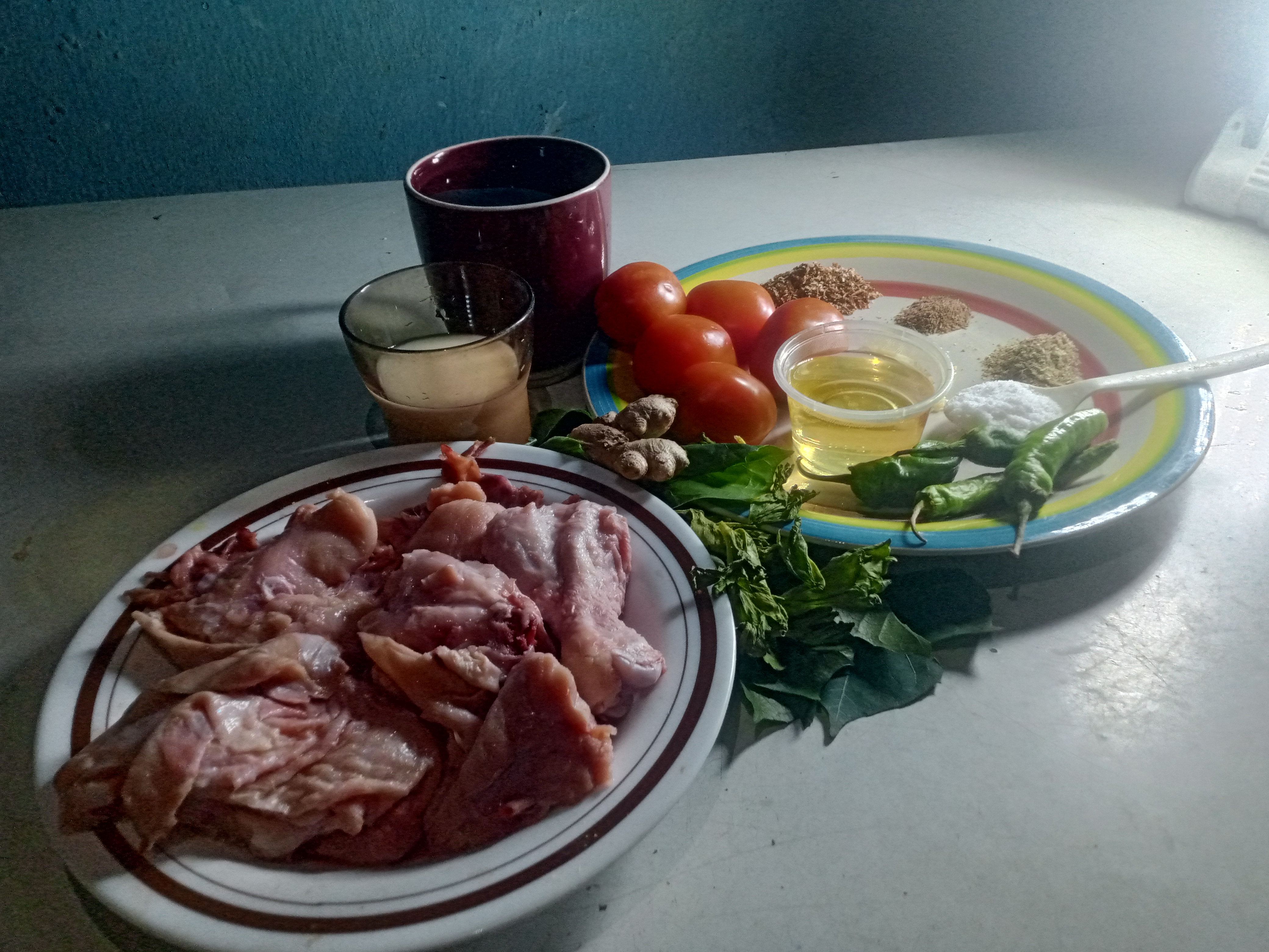 I started by grinding my cumin, coriander and dried red chilli. Then weighed my chicken. Because l got the seeds. Then l washed my chicken very well. I also cut my tomatoes as well.