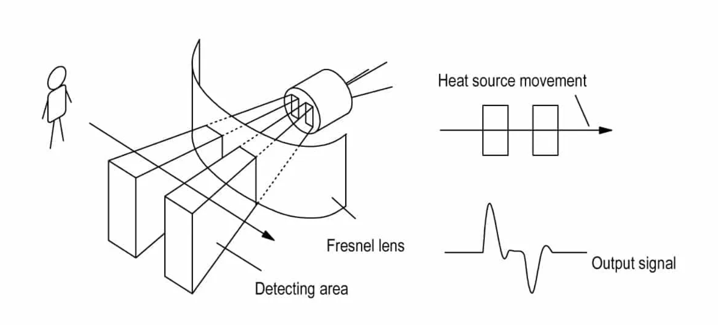 These sensors do not emit anything (hence the passive in the name), but on the contrary capture the infrared radiation emitted by warm-blooded living beings passing through the detection field of the sensor. To widen the detection area, these are often covered with a so-called Fresnel lens. Various electronic components process the raw output of the sensor itself and provide a digital output based on detected motion.