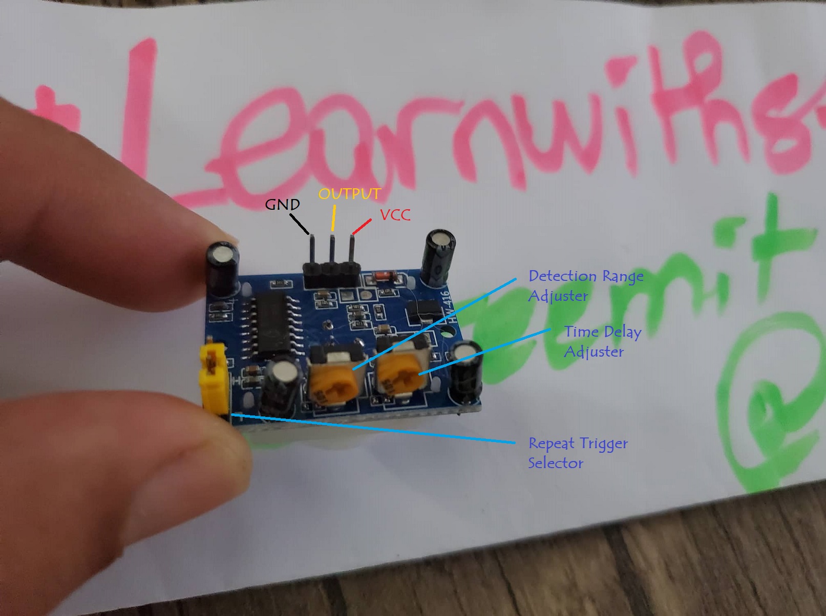 The HC-SR501 sensor has 3 pins as shown in the following figure :