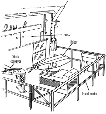 The principle here is that a distance guard such as fence made of bars is used to distance the worker from the dangerous part of a machine. By doing this, the operator will not be able to get close even by chance.