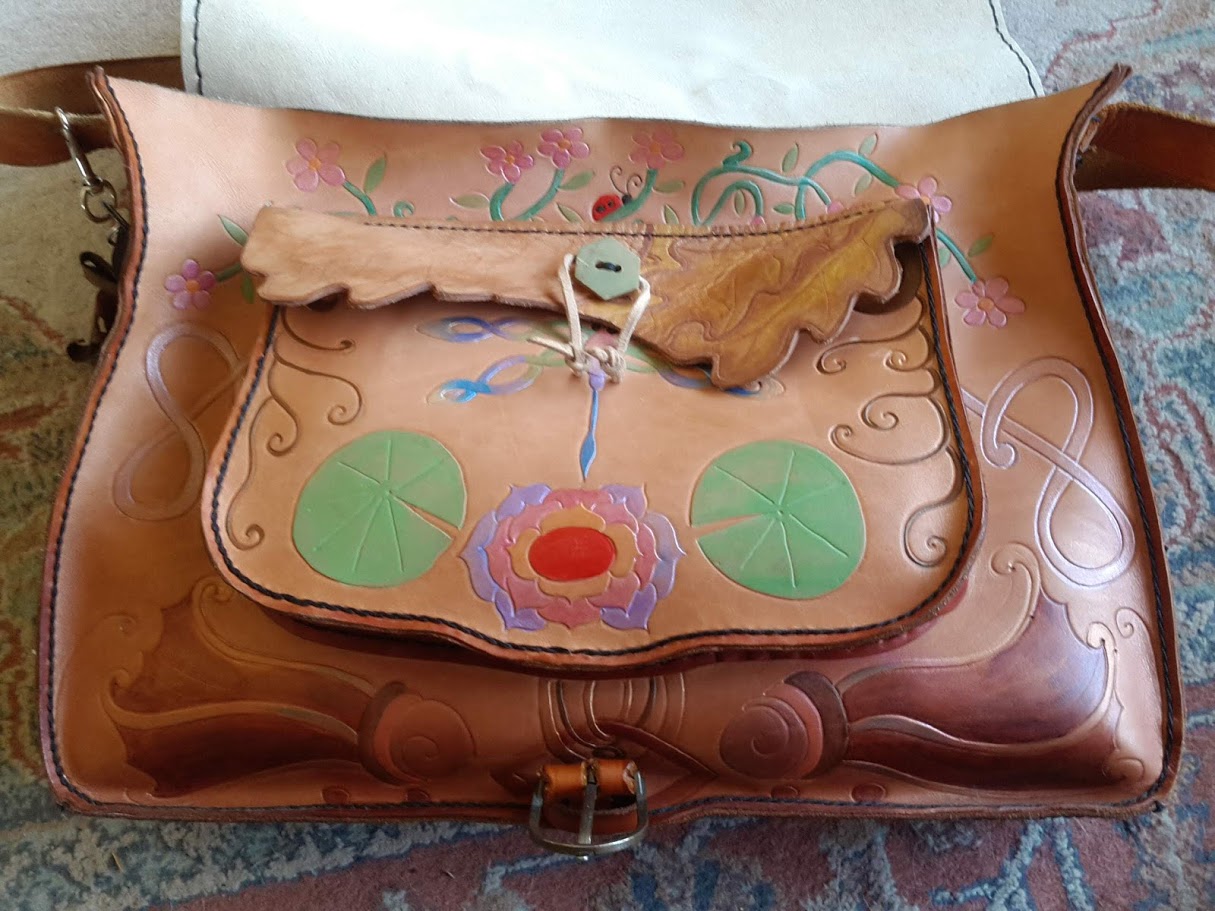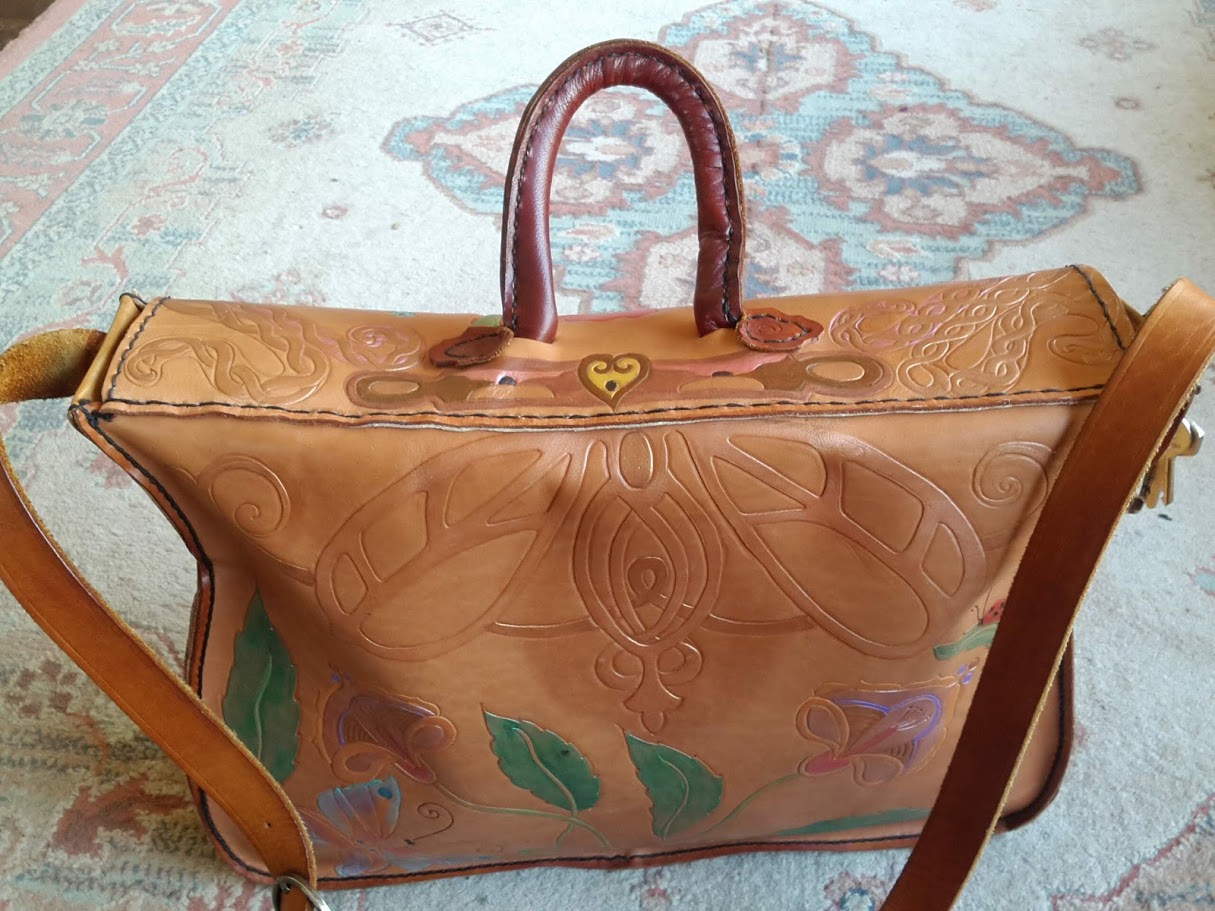 This capacious Carry-all entirely Handcrafted, Hand-tooled & Hand-painted with all of my favourite things. I made it for a Laptop. I live in South Africa (Jy weet mos!) The laptop was purloined one moonlit night, at knifepoint. This was a life lesson I do not care to repeat!