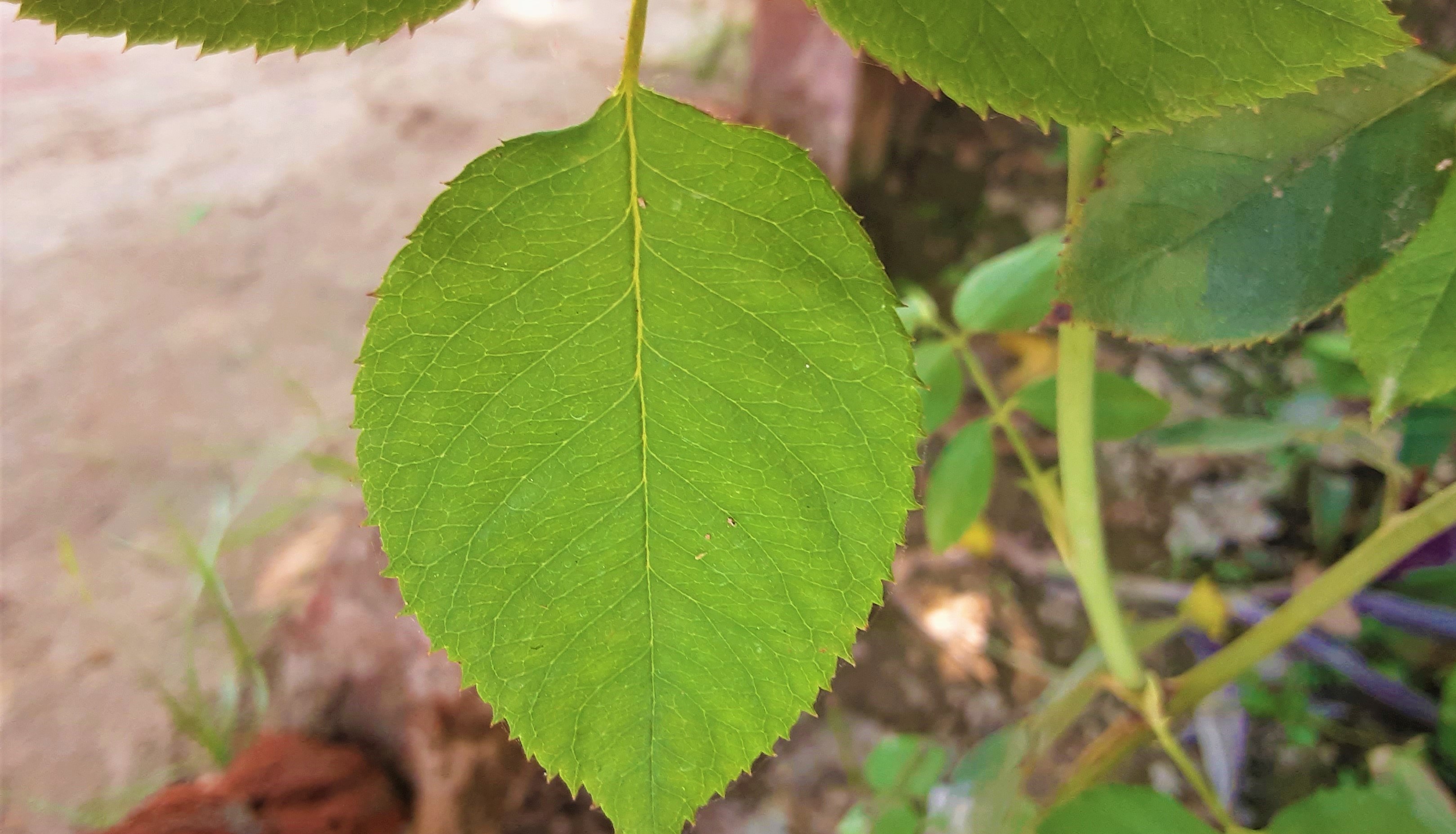 It is the green leaf of a rose. It has tinny thorns but its look is beautiful. It is usually from one to one & half inches in length (1-1.5 inc.) but it is not a fragrant leaf like a rose. This picture was taken by me from a nearby park. It is really an exciting picture. I edited this picture and its beauty increased. Really a pretty leaf created by nature.