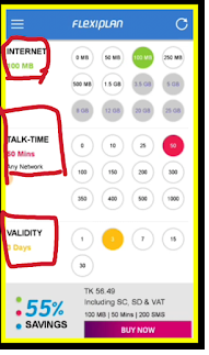 Flexiplan interface, flexiplan contains internet, talk time, validity, sms,