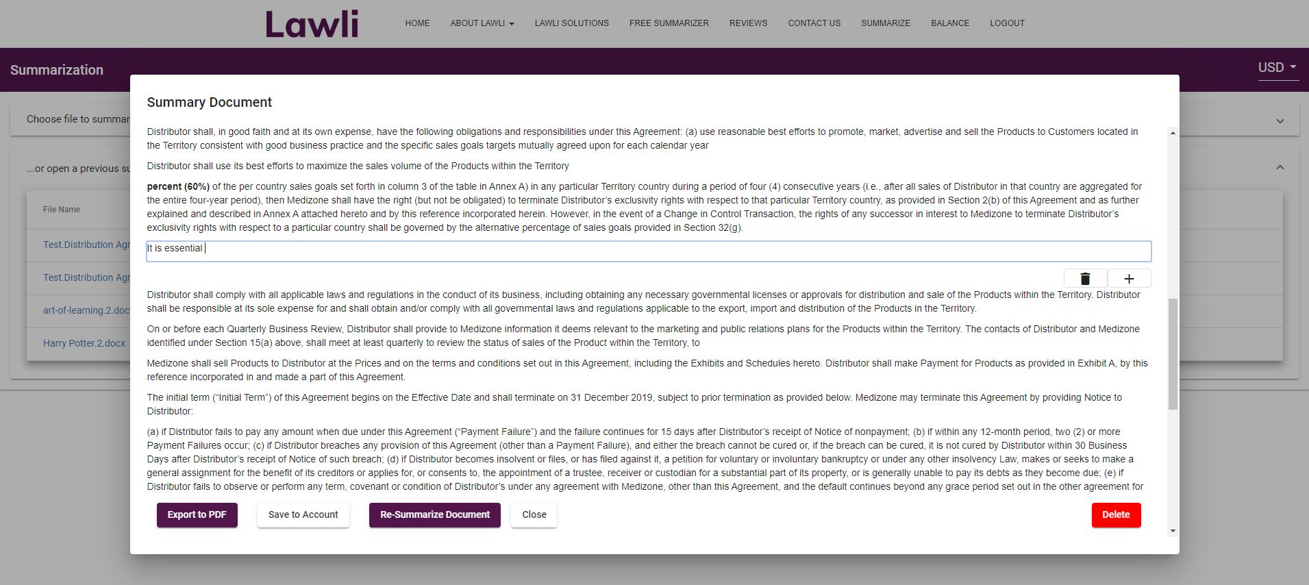 The first document summarization is free. After the user has uploaded and paid for the document, they can easily re-summarize the same text unlimited number of times applying different summary parameters. Lawli Summarizer can be used for any document, including research analyst papers, legal contracts, insurance policies, the dauntingly long government official reports such as the Mueller Report which most people did not have the courage to even open.