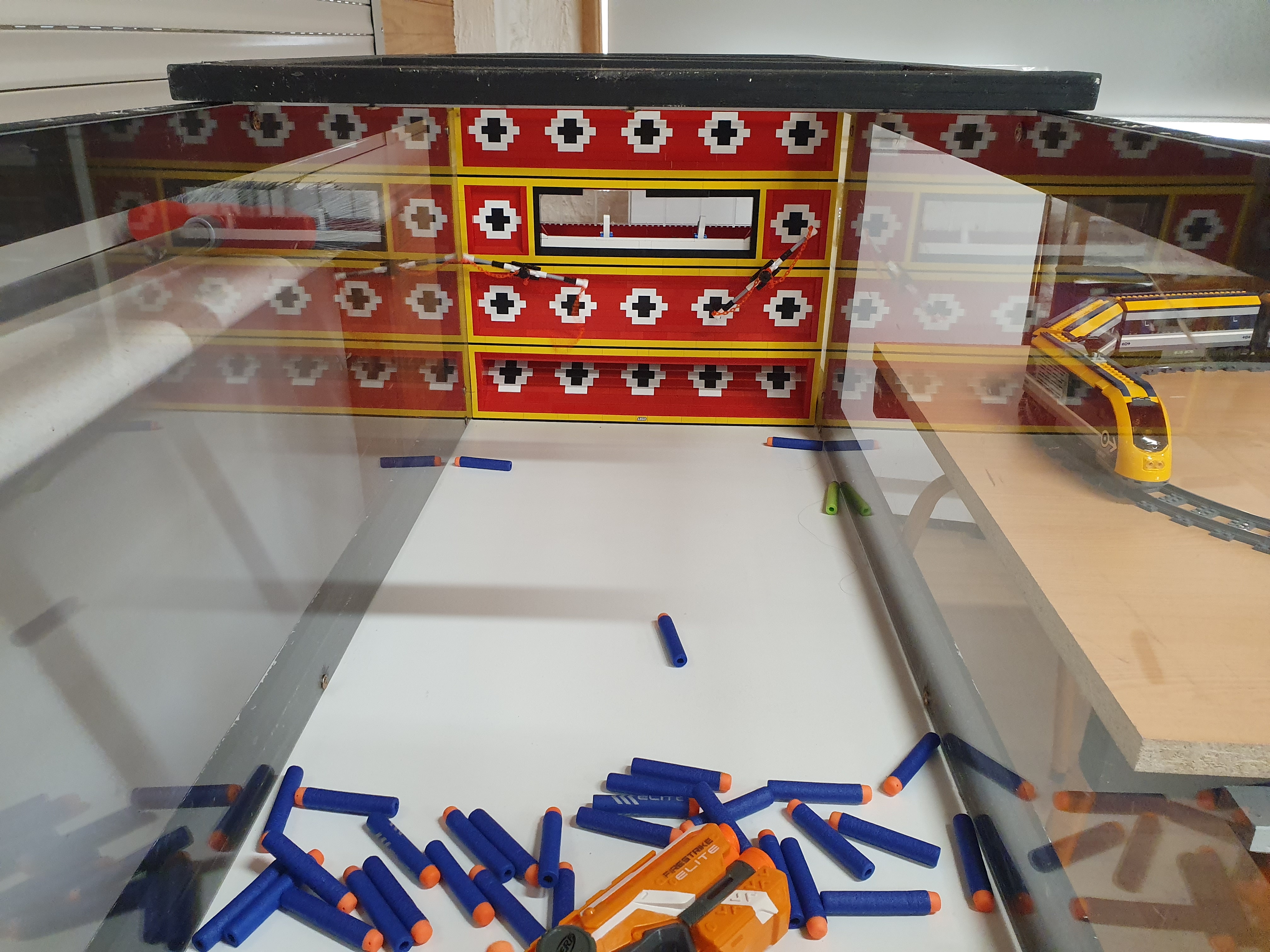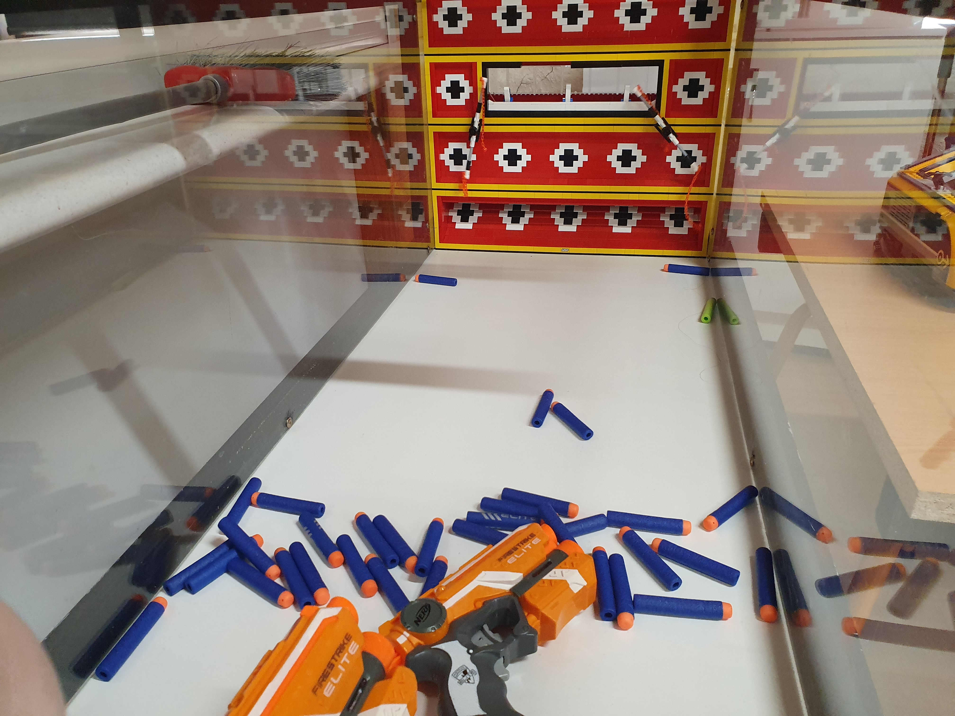 The aim being to fire the Nerf dart down range, avoid the rotating blockers and knock down the moving targets. Quite challenging, but a lot of fun. Unfortunately I couldn't get a clear picture of the mechanics behind it all.