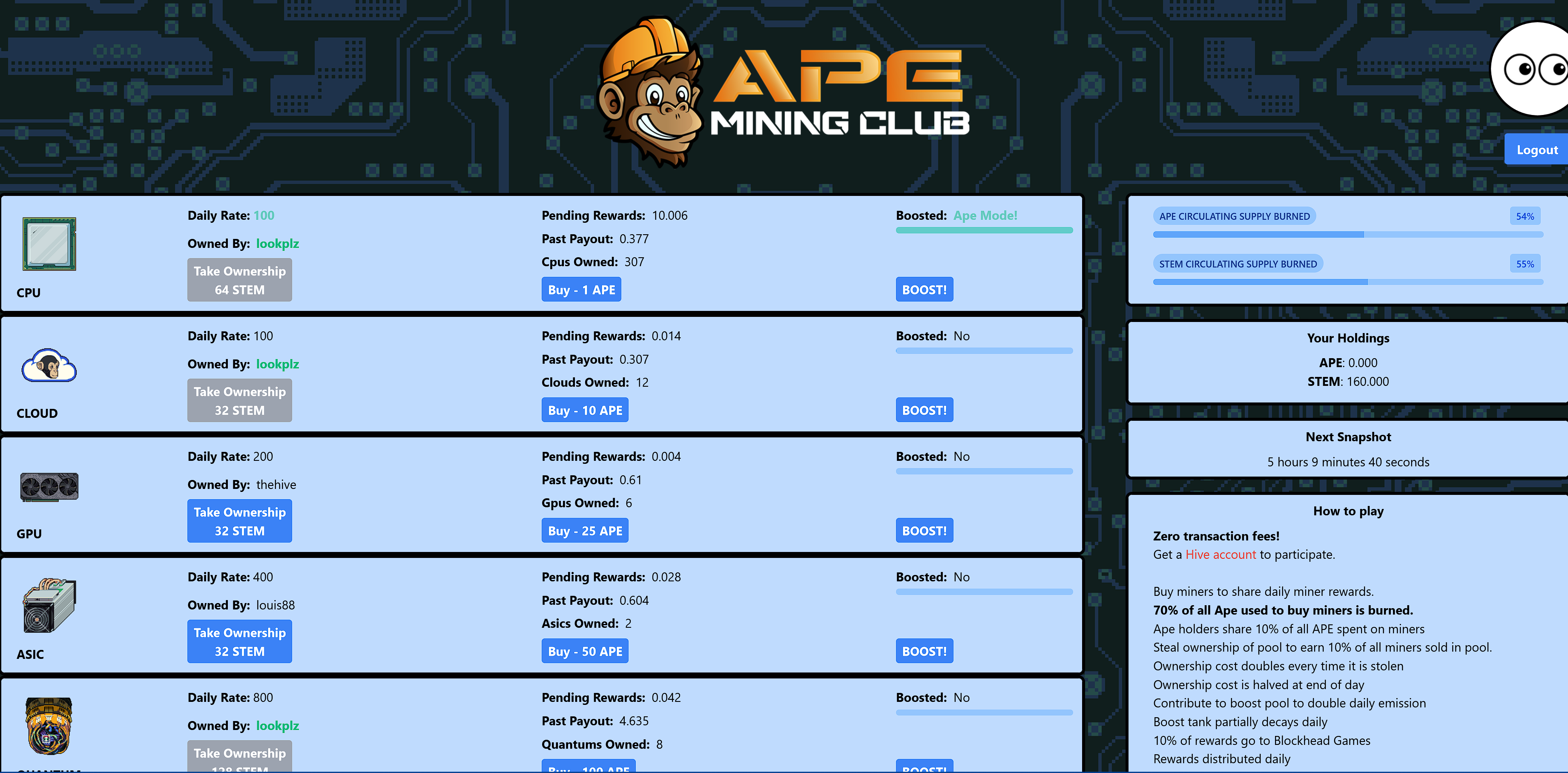 This post is different than my usual posts, but I felt a need to share it and hopefully help some people take advantage of my actions! Today I've spent enough STEM to boost the first pool on APE mining! It says "Ape Mode!" now, whereas I've never seen it say anything other than "Boosted: No" so I decided today to see how much STEM it would take to boost it and if it would be worth it. Essentially, I spent about 200 STEM to get it to where it's at. It seems to have doubled the daily production for the base level miner from "50" to "100" which is the rate of the second tier miners. Let's see how much of a difference this makes! :)