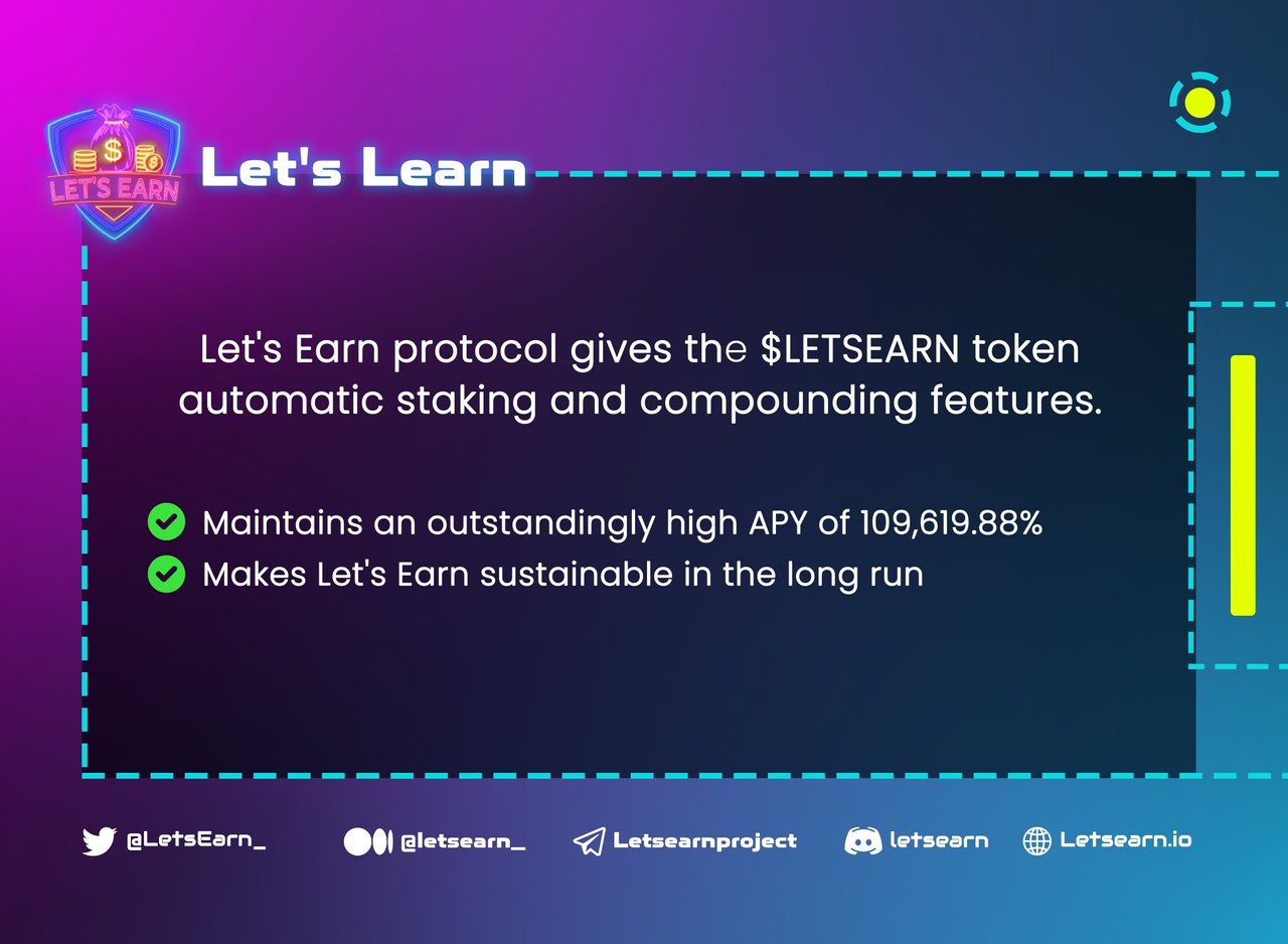 The $LETSEARN token features automatic staking and compounding functionality courtesy to the Let's Earn Protocol. The Let's Earn Protocol is optimised to be sustainable where other protocols will not survive in the longterm, while preserving an outstandingly high APY of 109,619.88 %.