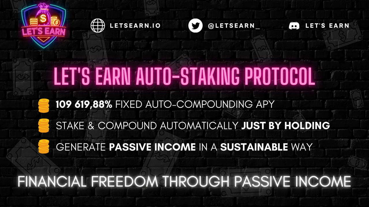 Holders of Let's Earn are rewarded with automatic compounding interest, increasing their $letsearn holdings in a sustainable manner over time.