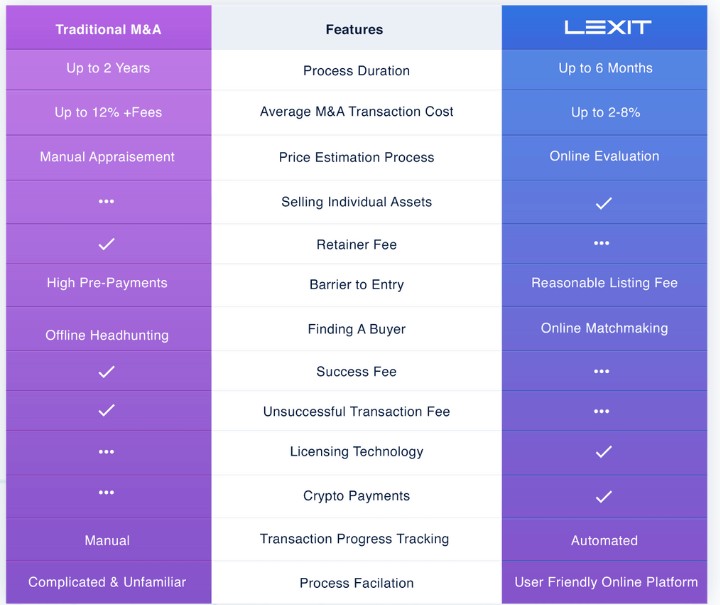 Note that: Traditional M&A transaction can take up to two years from start to finish while purchase agreements on LEXIT can be finalized and signed within 12 weeks.