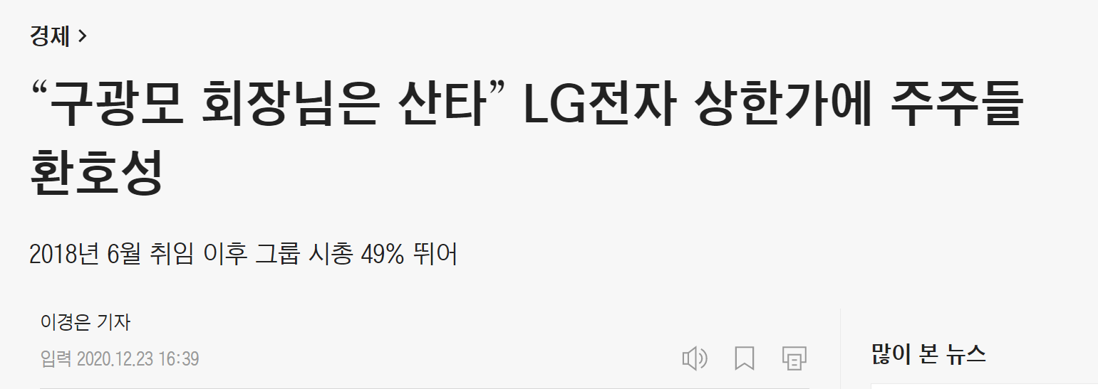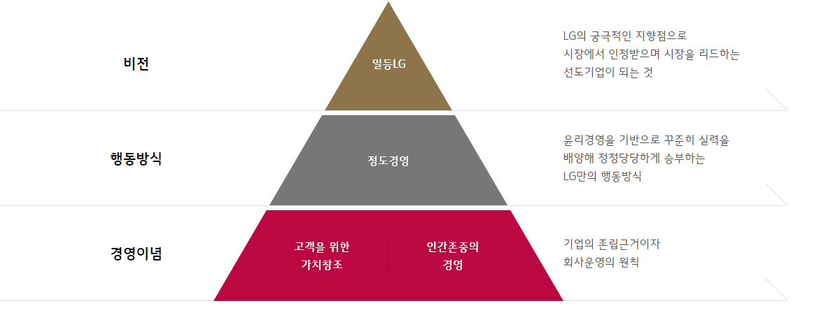 LG 는 삼성에 비해 항상 각광받지 못했다. 하지만 국민들은 누구나도 알수 있었던건 LG는 청렴과 신념이 투철하다. 박근혜 전대통령의 국정 농단 때에도 LG는 떳떳했으며 구광모 체제로 변하면서 신념은 변하지 않았다. 하지만 전략적인 투자와 방향성이 바뀌였는데 이는 신사업 먹거리 중점으로 개선되는 중이다.
