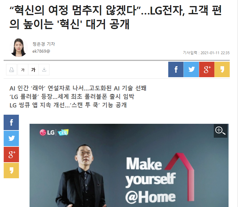 LG전자의 혁신은 계속된다. 조금더 우리의 삶에 기점을 두며 어느센가 LG핸드폰이 많이 보이고 집안 곳곳에서 LG제품의 실용성을 보게될것이다. LG전자는 많은 변화를 거치고있다. 우리 눈에는 비록 보이지 않지만 LG는 점점 규모가 커지고 있다. 투자를 지금 시작했더라면 LG주식들을 봐두는것이 좋겠다. 구광모의 행보가 어떤지, LG가 어떻게 변화하고 있는지를 잘 지켜봤으면 좋겠다.