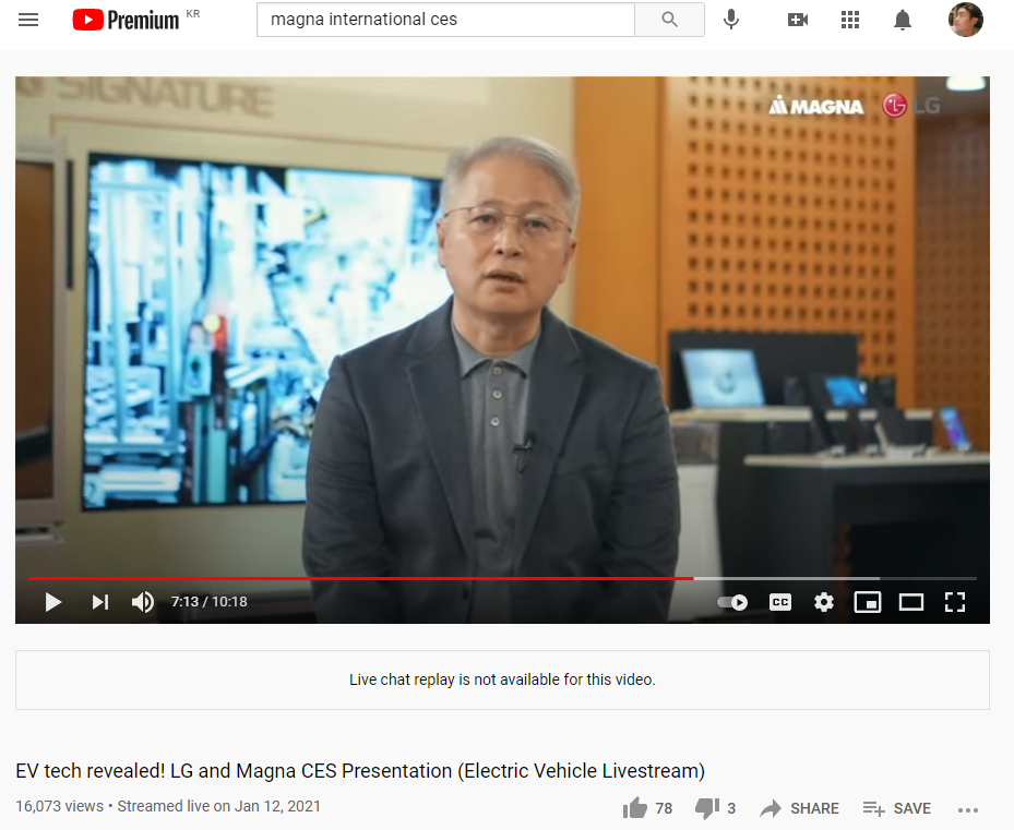 세계 최대 IT 전시회인 CES (Consumer Electronics Show)는 2021년에 온라인으로 개최되었다. 각 회사들에서 멋잇는 동영상으로 신제품과 방향성을 보여주었는데 Magna International 영상을 보면 LG전자와의 협력에 대해 굉장히 자부심도 나타내며 긍정적인 태도를 취했다. 심지어 LG 관계자 두분이 영상에 나오셔서 합작에 대해 설명한다.