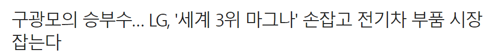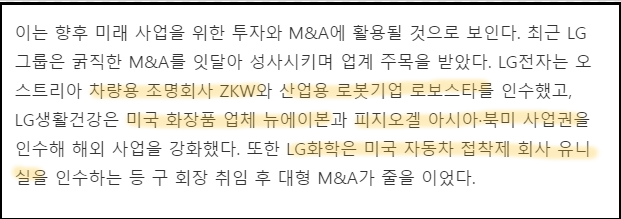 구광모의 투자는 차량용 조명회사 ZKW, 산업용 로봇기업 로보스타, 미국화장품 업체 뉴에이본, 피지오겔, 미국 자동차 접착제 회사 유니실 등 대형 M&A가 구광모 체제 안에서 일어났다. LG전자는 얼마전 Magna International 과 합작 회사를 설립하며 이번 CES International 에서도 확실하게 두 회사의 협력과 의지를 나타냈다.