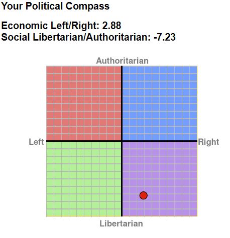 The rest of the site is interesting too as it pitches political philosophers on the chart too. I come out sitting on top of Thomas Paine ....maybe a hairbreadth to the left.
