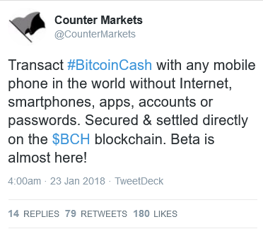This one is a little vague, but Counter Markets (@capital) has been working on a payment system for BitCoin Cash (BCH) that will facilitate mass-adoption of the currency. Now, there is a lot of controversy and discussion going on between BTC and BCH, but the motivation for Counter Markets to choose BCH for their project seems to be the low transaction costs of BCH. According to their tweets, this project sounds very promising. Let's hope that it will live up to its potential and become available for other cryptocurrencies to adopt. Beta will be coming in February of 2018.