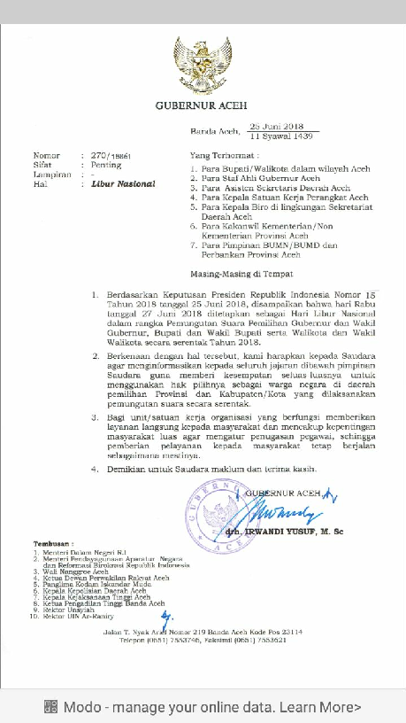 Pemerintah menetapkan rabu hari libur nasional tanggal 27 juni 2018 mengingat besok pemilu serentak seluruh provinsi di indonesia