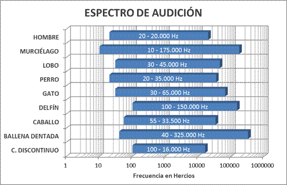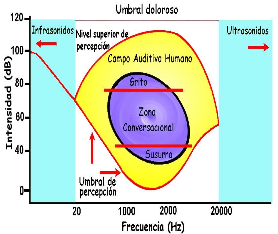 La capacidad auditiva humana varía de 20 Hertz a 21,000 Hertz (20 KHz) y puede escuchar a partir de los 0 decibeles (dB= décima parte de un Bell; unidad de intensidad), hasta niveles tan altos como los 120 dB, donde evidentemente se verificará un daño en el órgano de la audición: la cóclea (el caracol), que se encuentra contenido en el oído interno.