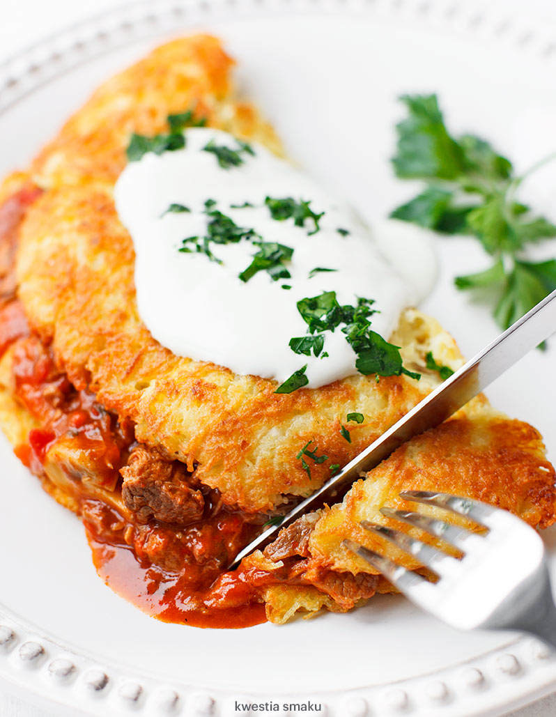 - Put on a plate, put hot stew and fold in half. On top, pour over thick cream and sprinkle with parsley.