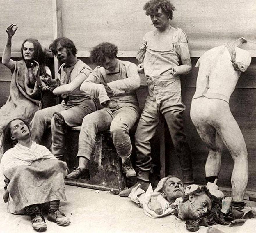 Melted and damaged mannequins after a fire at Madam Tussaud’s Wax Museum in London, 1930