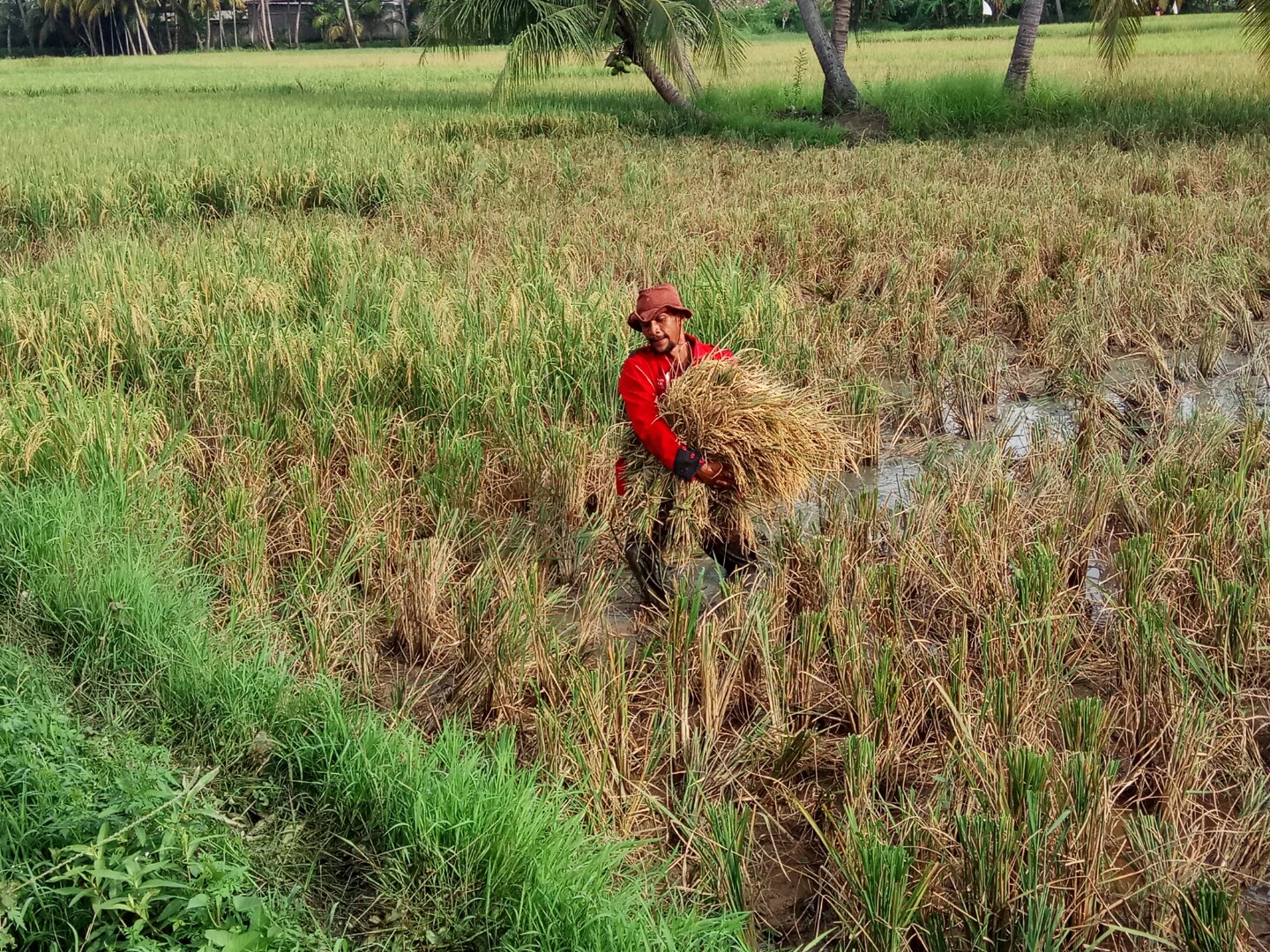 A few days ago I passed one of Pak Zaenal's rice fields which happened to be my best friend, I saw that he was very overwhelmed during this harvest season because there was still a lot of water and mud in the fields which made the rice cutting car unable to sign in here ... Haha ...
