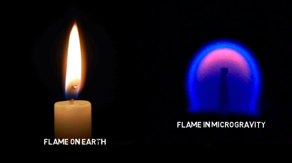 Confused?? Okay, you will understand it. Just look at the image below. It shows that how flame on earth looks like and how flame under zero gravity influence i.e., in space looks like.