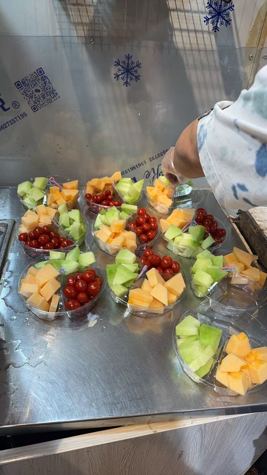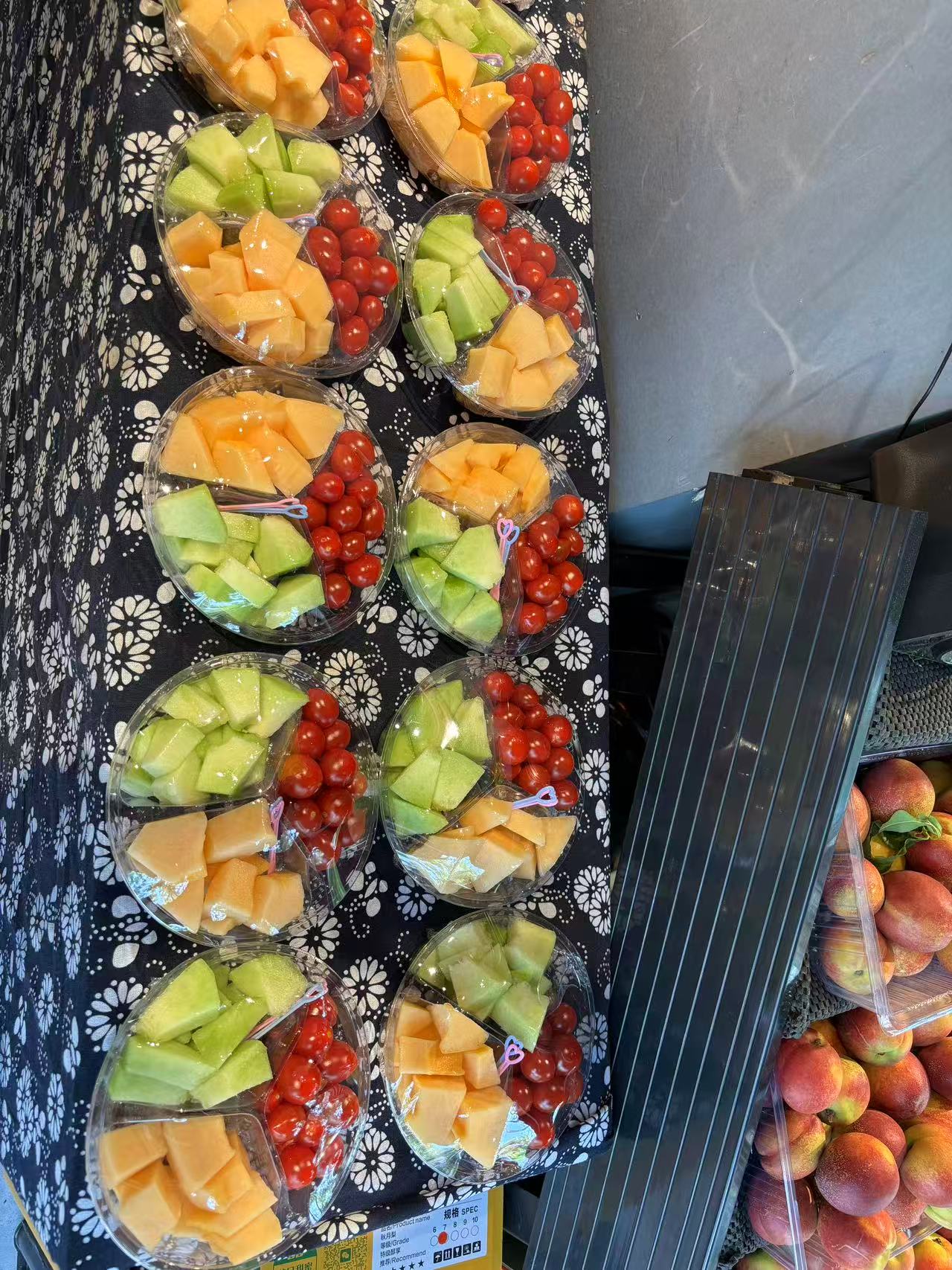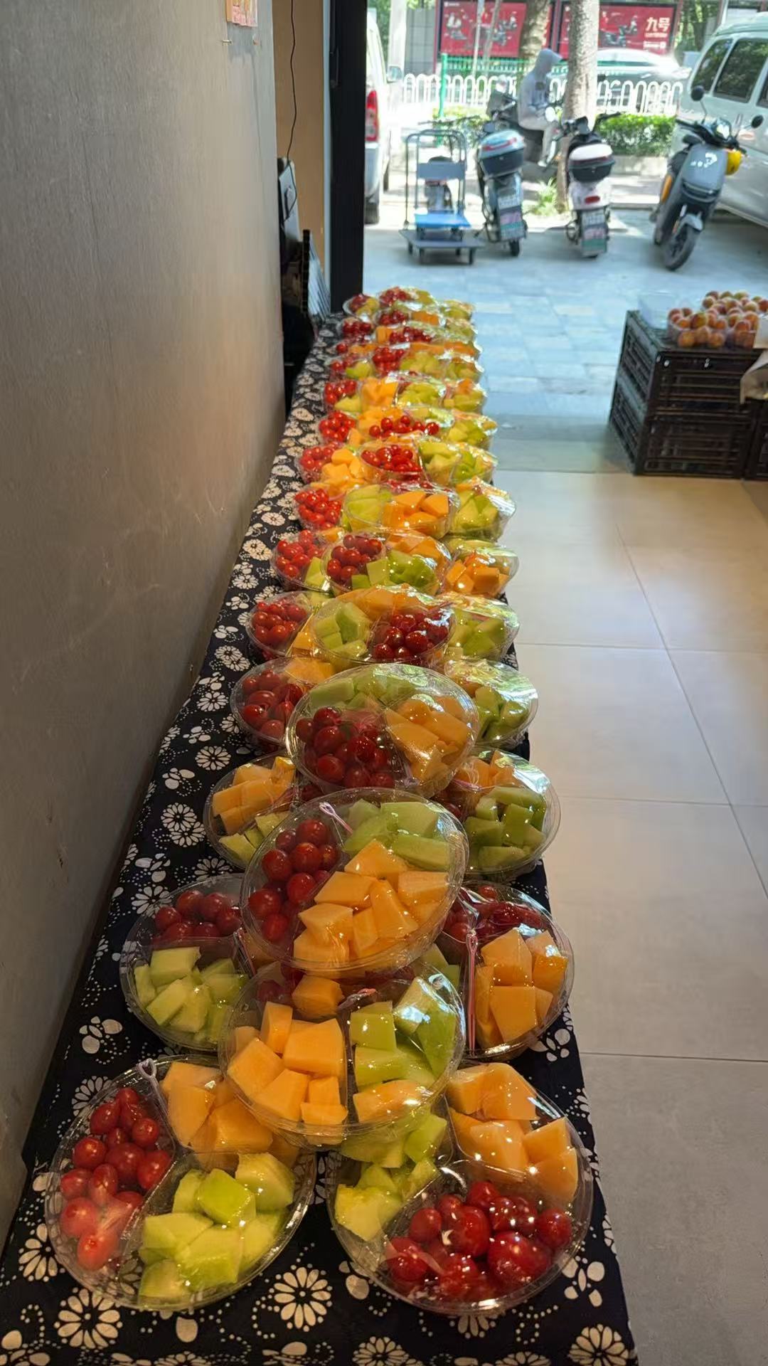 家委还非常贴心的给每个小朋友在外面准备了一些水果切盘。班上有40多个小朋友,每个小朋友一份,然后再给老师两份。