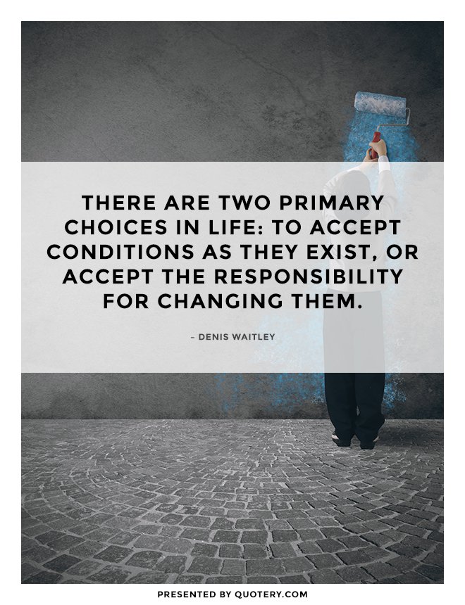 “There are two primary choices in life; to accept condition as they exist, or accept the responsibility for changing them.”Denis Waitley