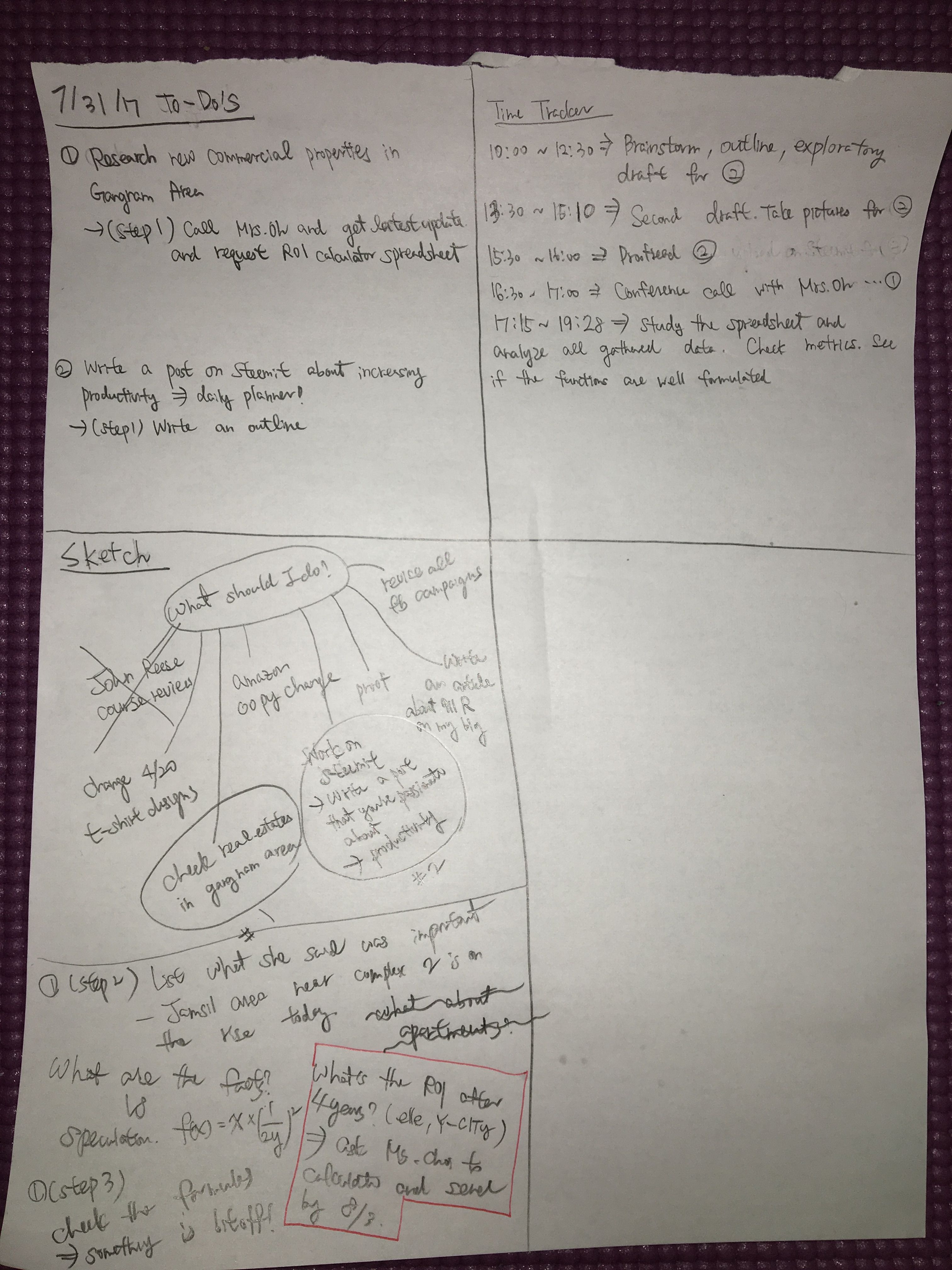 It should come our fairly easy. If not, use the lower left section to brainstorm by scribbling. And find your two priorities for today's to-do tasks.