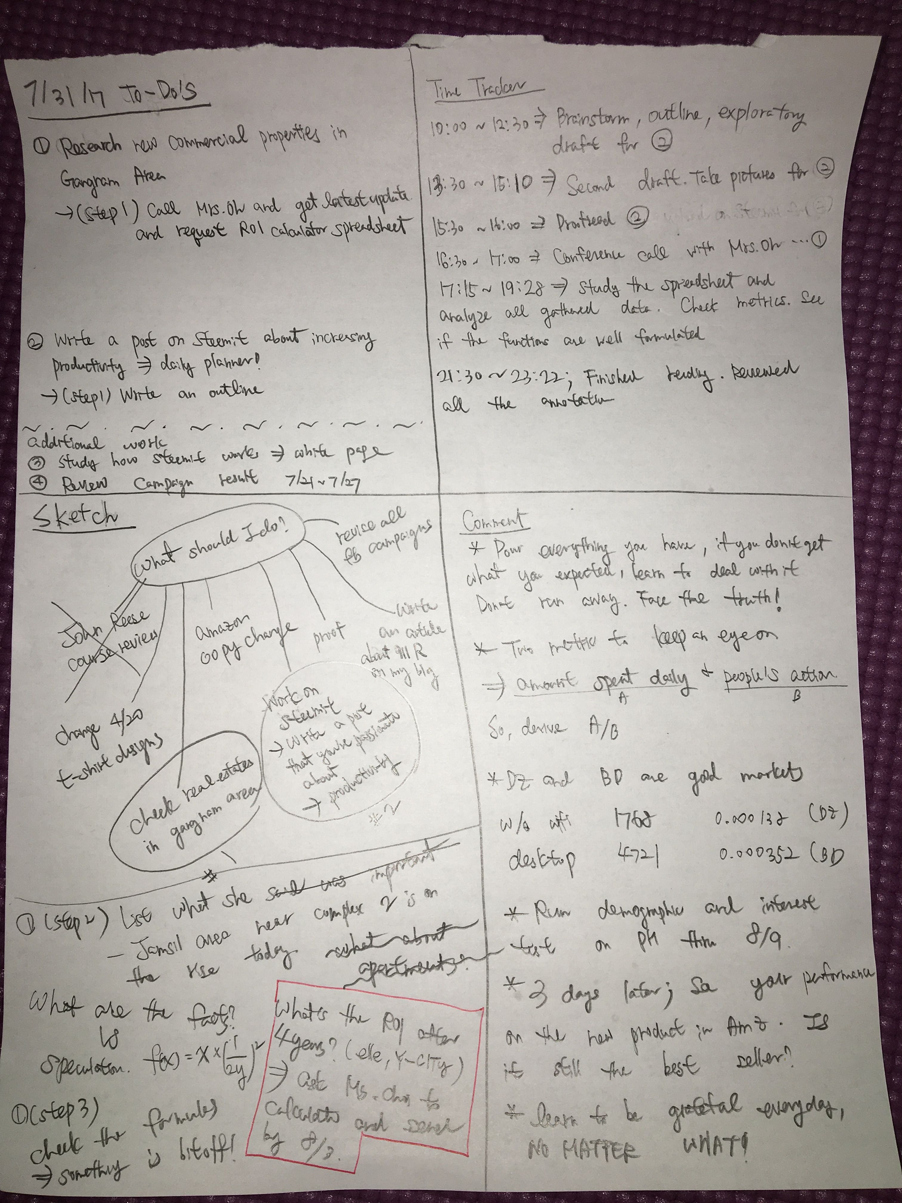 This is where you write stuff when you have the AHA moment that keeps you motivated and keeps you in the game of mass production. Jot down whatever that empowers you whether it's directly related with the two priorities or not. This is also a place where you squeeze in an idea so you can shorten the process of handling the task that you've worked on today.