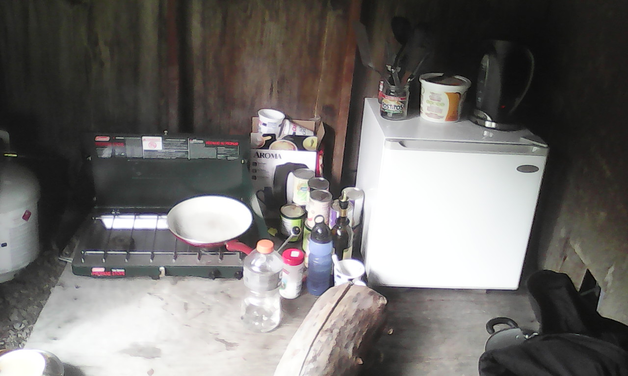 As the shack has no electrical or plumbing, we ran a long extension cord from the main house to the shack to power my devices and a water boiler for making tea. For the kitchen, I bought a propane stove with a nice big tank, and most recently, a mini-fridge off of craigslist.