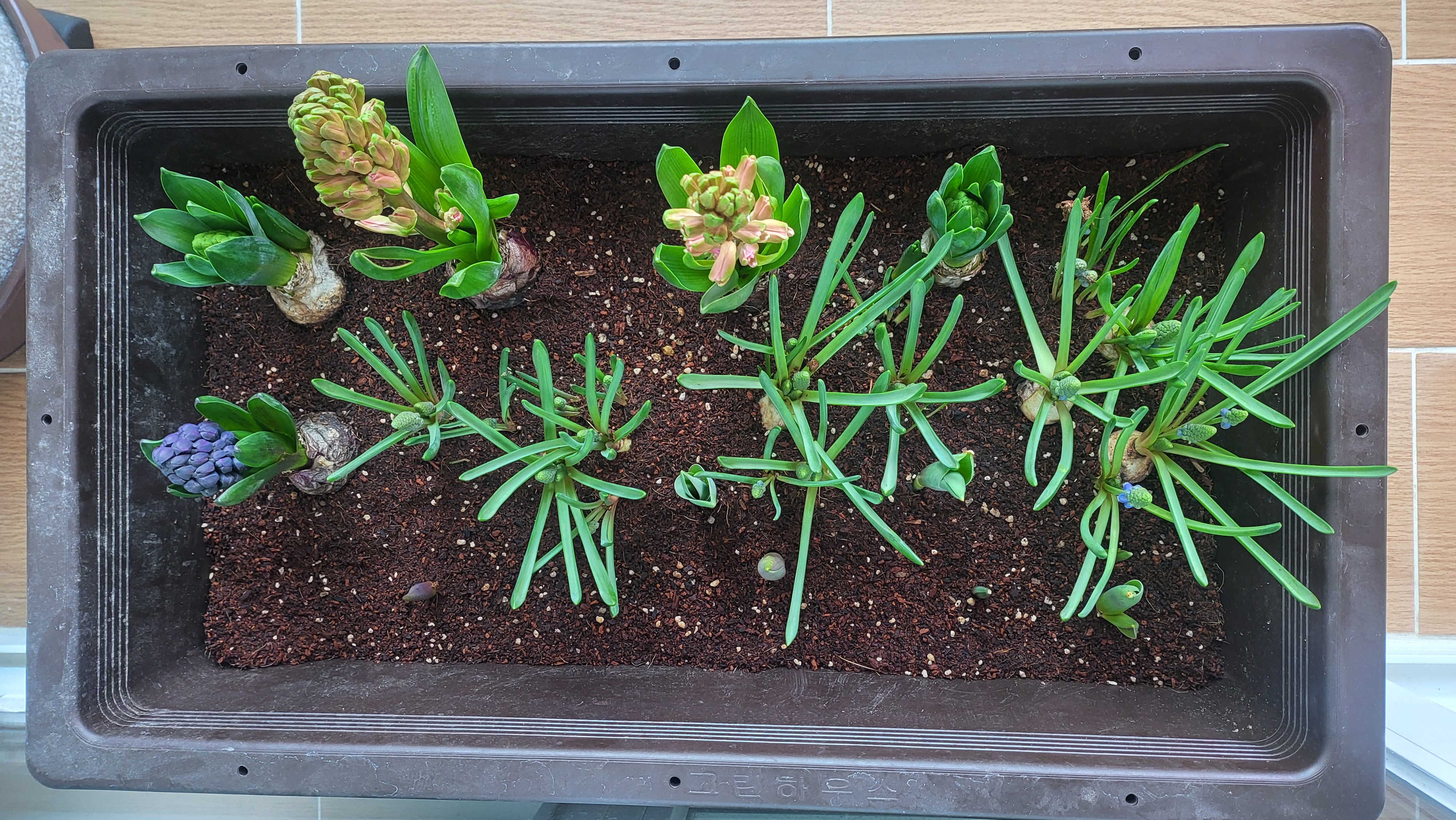 한국 일기 #299cabbagelover (65)in #life • last month 2026.3.16(월) 오랜만에 베란다 화단을 봤더니 튤립과 히아신스가 많이 자랐다. 꽤 크다. 다 자라면 어떤 모습일지 궁금하다. 식물들이 알아서 너무 잘 자라주니 똥손인 나도 잘 키울수 있겠다는 자신이 생긴다. 쪼끔한 게 이렇게 날 기쁘게 하다니. 귀여운 녀석들. 튤립과 히아신스 #korea #krsuccess