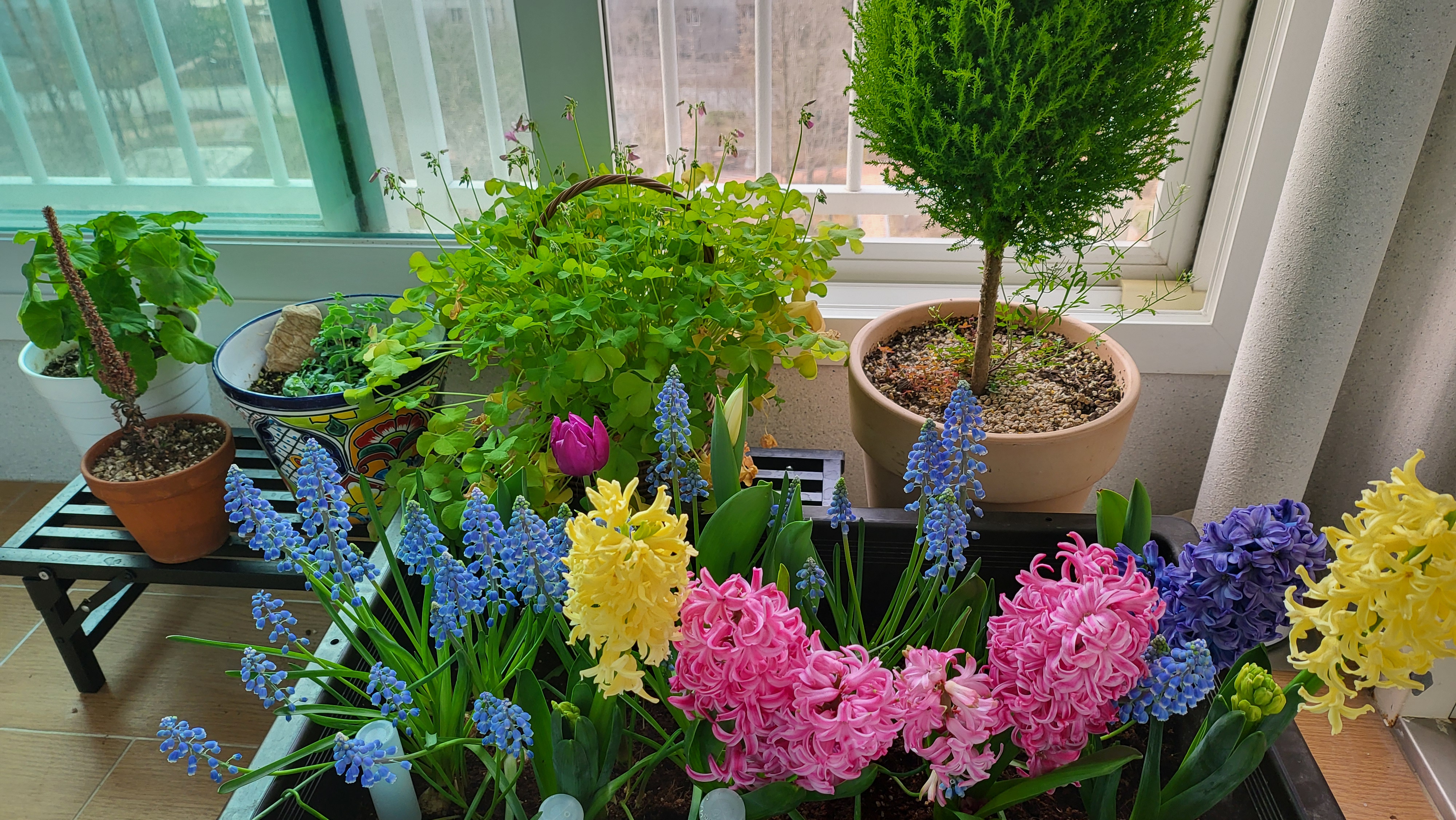 한국 일기 #306cabbagelover (65)in #life • last month (edited)2026.3.27(금) 튤립이 핀 걸 오늘 처음 봤다. 그런데 지난번 찍은 사진에도 자주빛 튤립꽃이 피어있었다니. 히아신스와 무스카리가 꽃이 크고 화려해서 작고 수줍게 핀 튤립을 보지 못했나보다. 미안해~~ 사랑초도 꽃을 피우고 있다. 이제 정말 봄이다. 베란다 화단 #korea #krsuccess