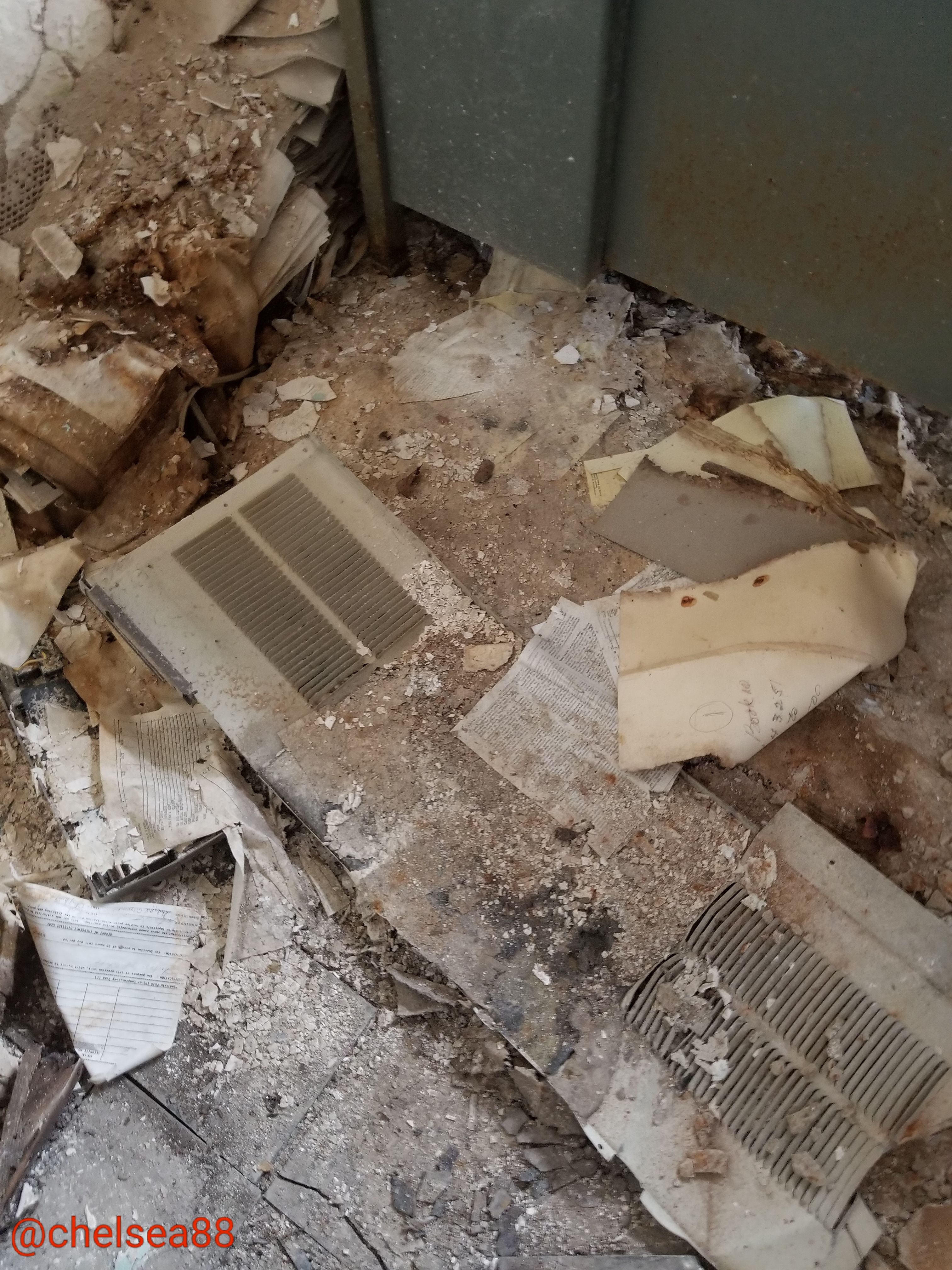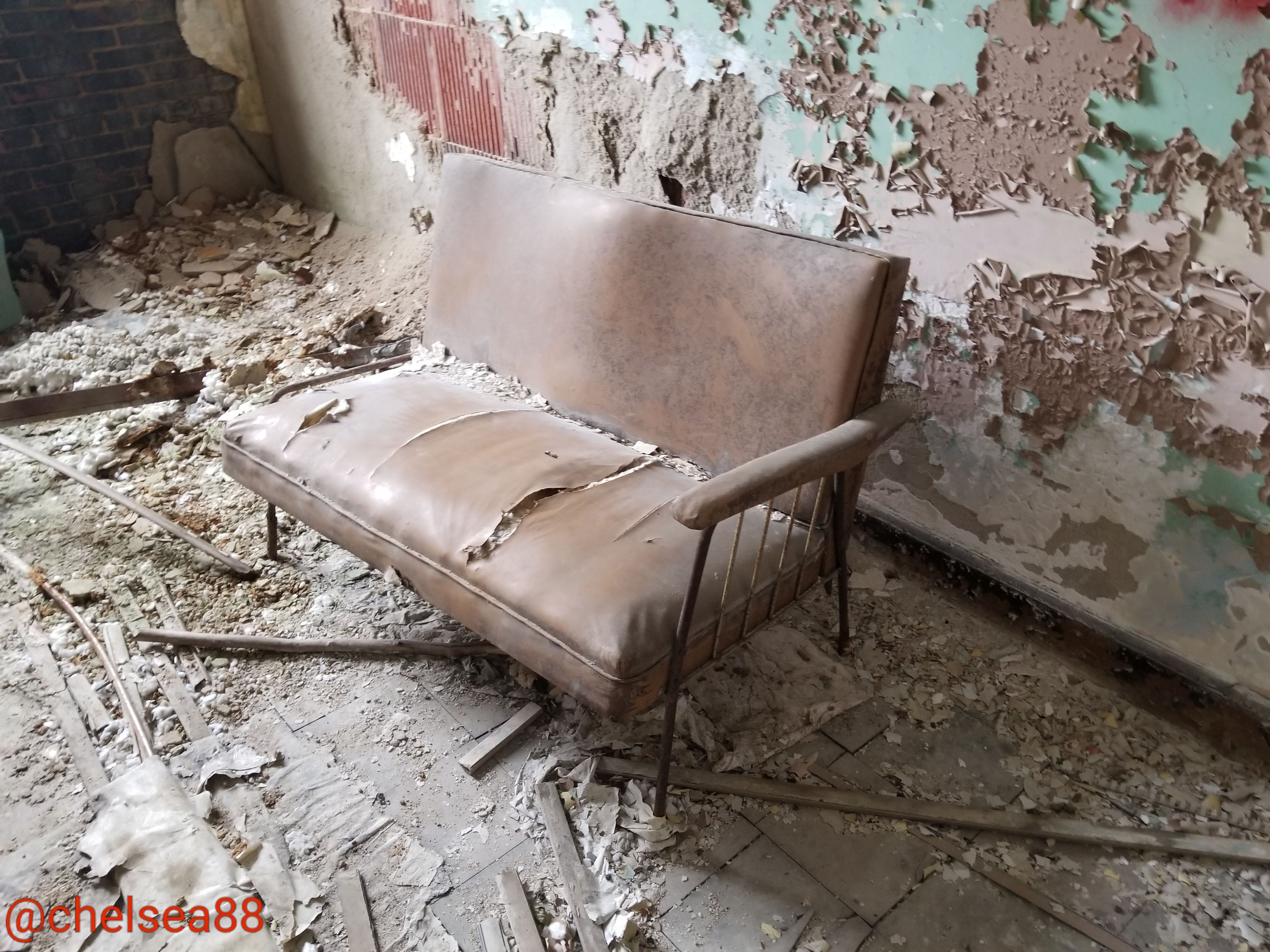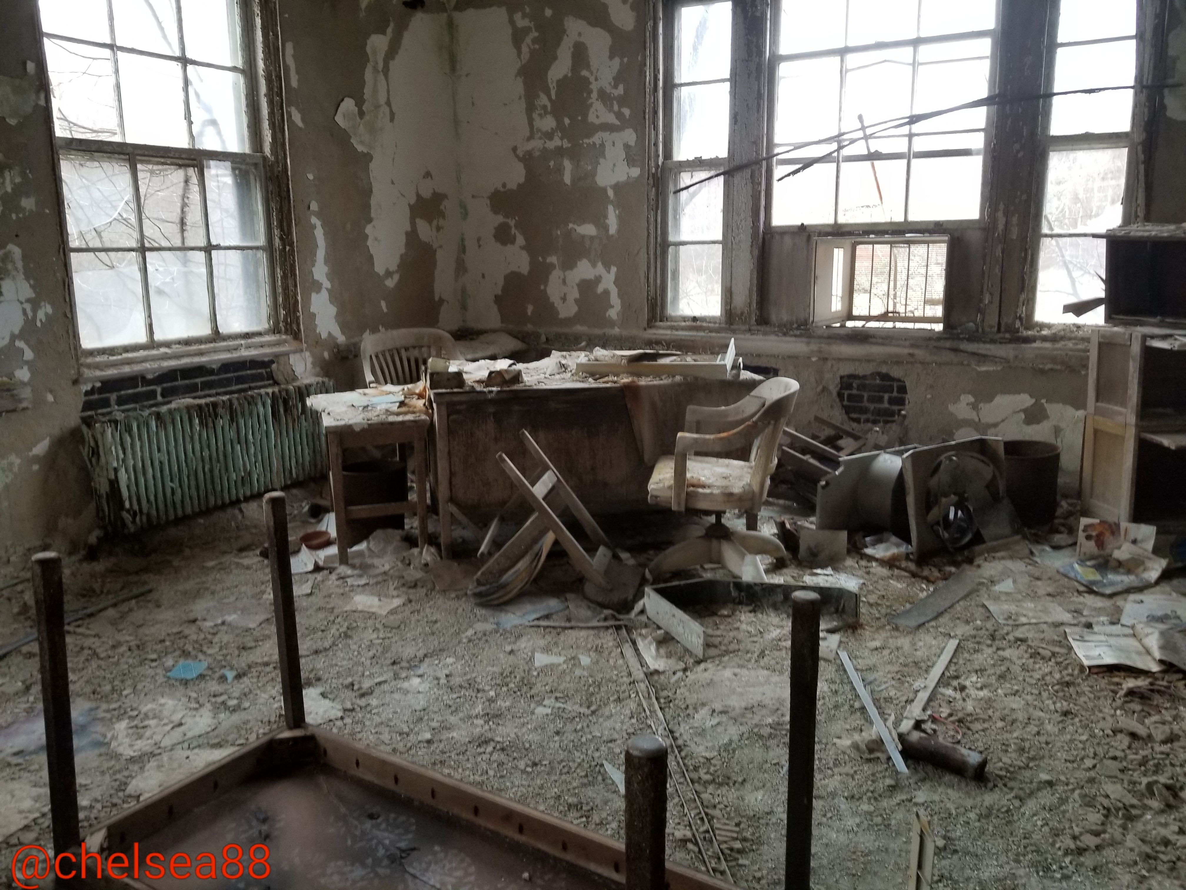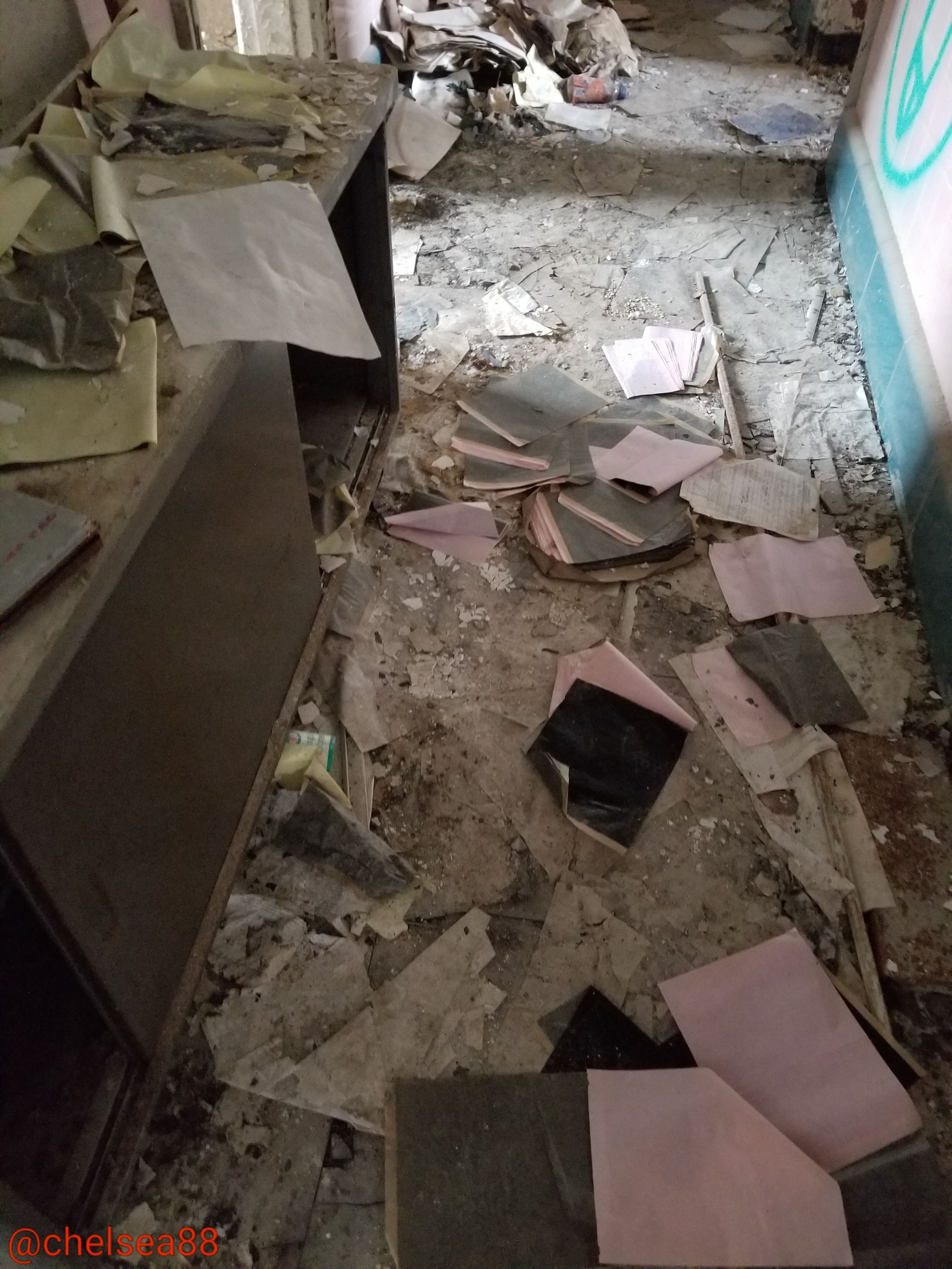 As you can see, parts of the forest haven facilities are remarkably intact. The stark contrast of the drapes with the decay and peeling paint was interesting to me. Additionally, the in somewhat decent condition typewriter and sofa in contrast to the disarray and patient files scattered throughout. It has been this way since 1991 when the facility finally moved the 15 remaining residents elsewhere, more than a decade following the 1978 court ordered shut down of this place.