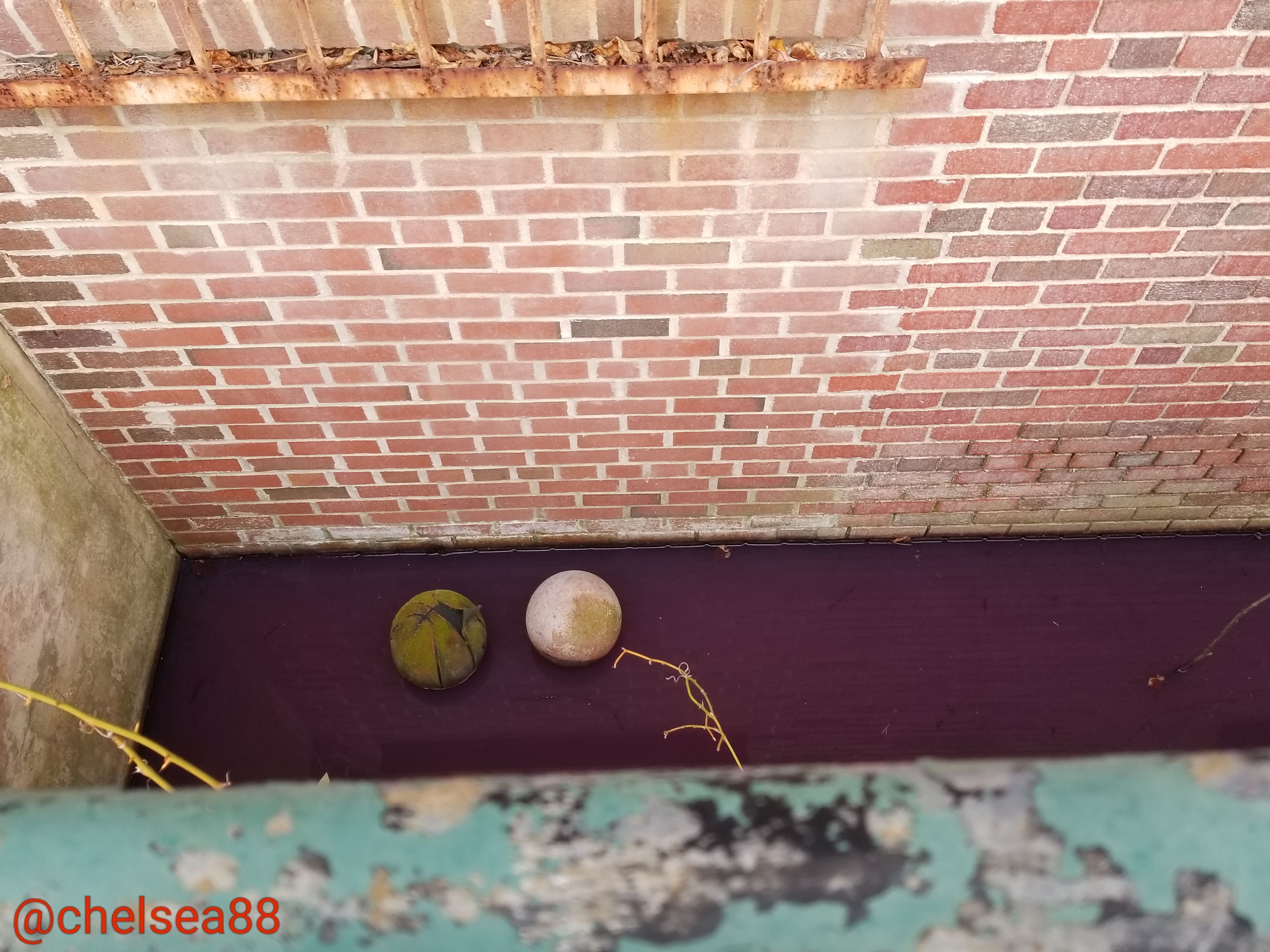 Yes, that pinkish/ red stuff is the actual color of the water...perhaps from the bricks or littered paint cans from graffiti artists.... all the more eery of course those basketballs just hanging out floating on the water, seemingly abandoned mid-game from the nearby court...