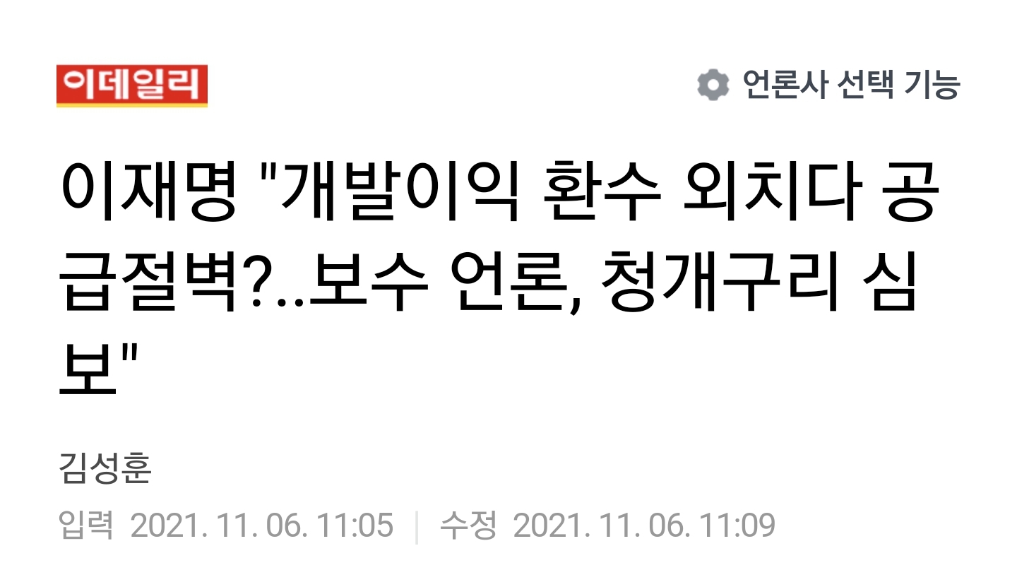 이 후보는 이날 오전 페이스북에서 “보수언론은 막상 ‘개발이익 환수제’가 추진되자 ‘민간 이익 제한하면 안 된다’고 문제를 제기한다”며 이같이 말했다.