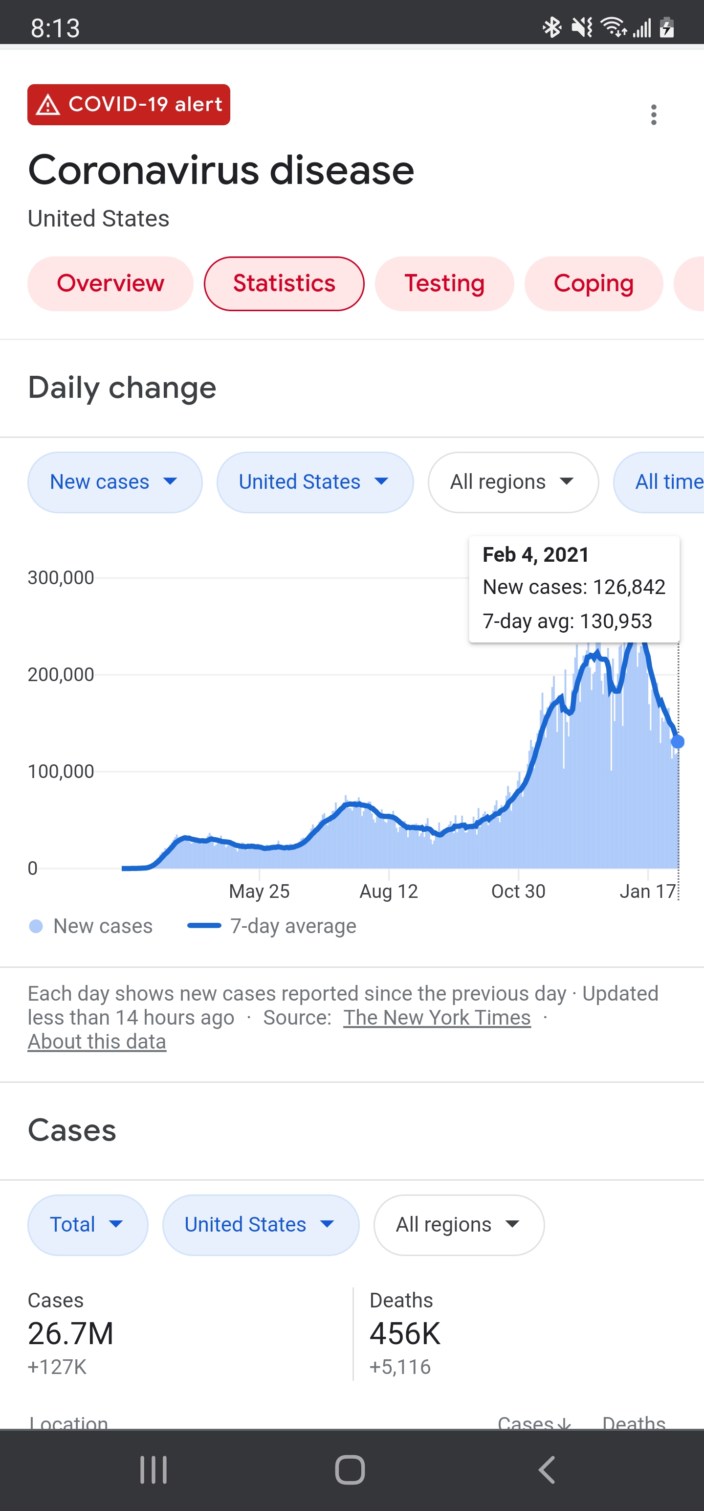 코로나 바이러스 (2월 5일)coldsiksu (82)in #life • 5 years ago 2월 5일 코로나 바이러스 확진자수는 어제보다 약 12만명이 증가한 총 2670만명의 누적 확진자를 기록하였다. 확실히 요즘 확진자 추세가 꺽인거 같이 보인다. 얼마전만 하더라도 하루 확진자수가 30만명을 넘어 희망이 보이지 않았지만 요즘 보면.. 확진자수가 확실히 줄어서 백신의 보급에 힘입어 일상적인 생활로 돌아갈수 있을까 하는 희망이 보인다