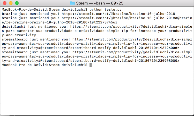 Como eu comentei no meu primeiro post aqui, meu objetivo maior é em algum momento contribuir para a comunidade. Por isso fui fuçar nas APIs e bibliotecas disponíveis para interagir com a blockchain do Steem. Em algumas horas já tinha montado um sistema gigante de estudo, com listas de tarefas organizadas e várias idéias de projetos. Duas tardes depois já tenho um micro protótipo rodando. Já consigo fazer uma busca por posts e comentários e extrair as menções a meu usuário.
