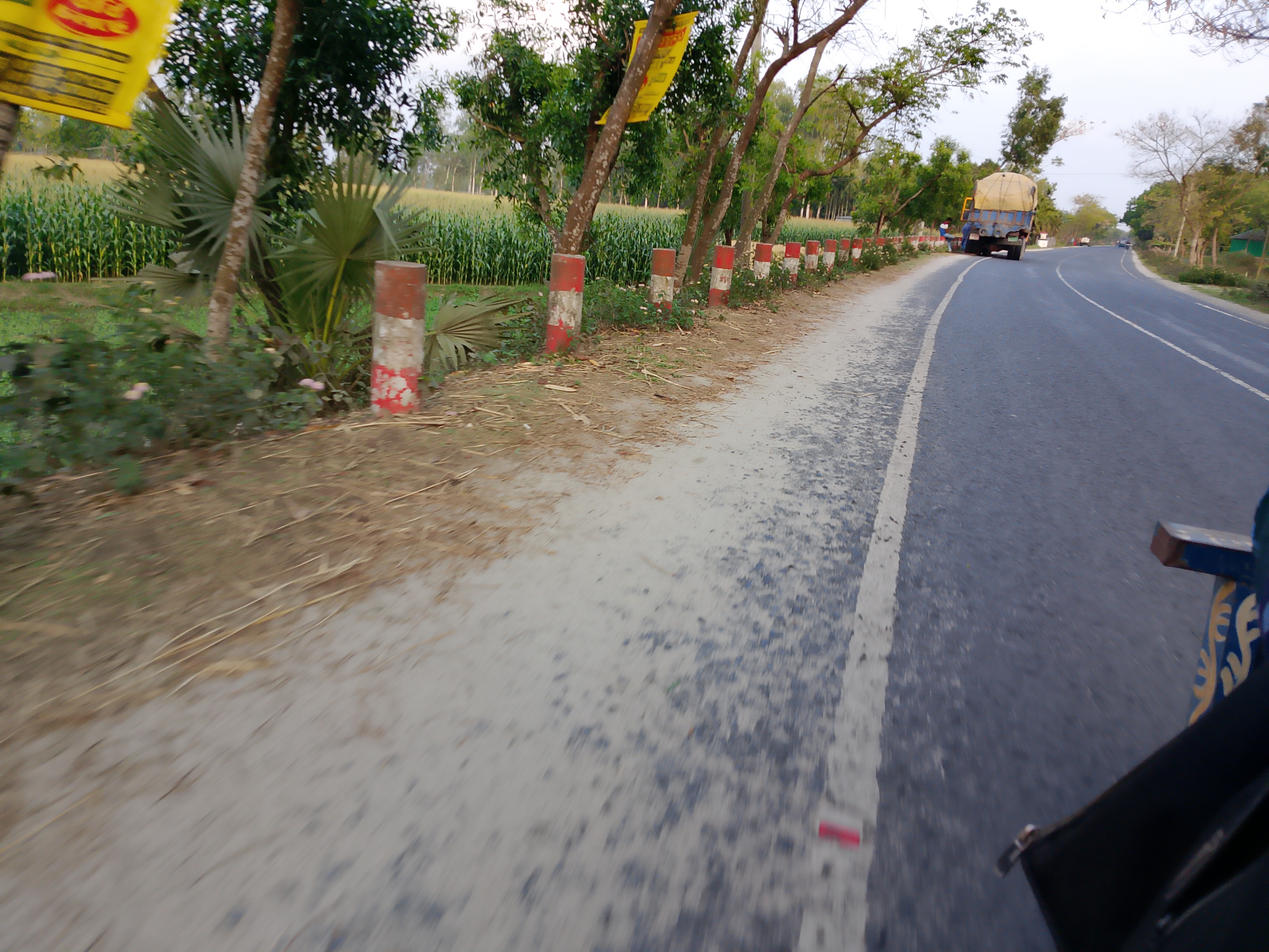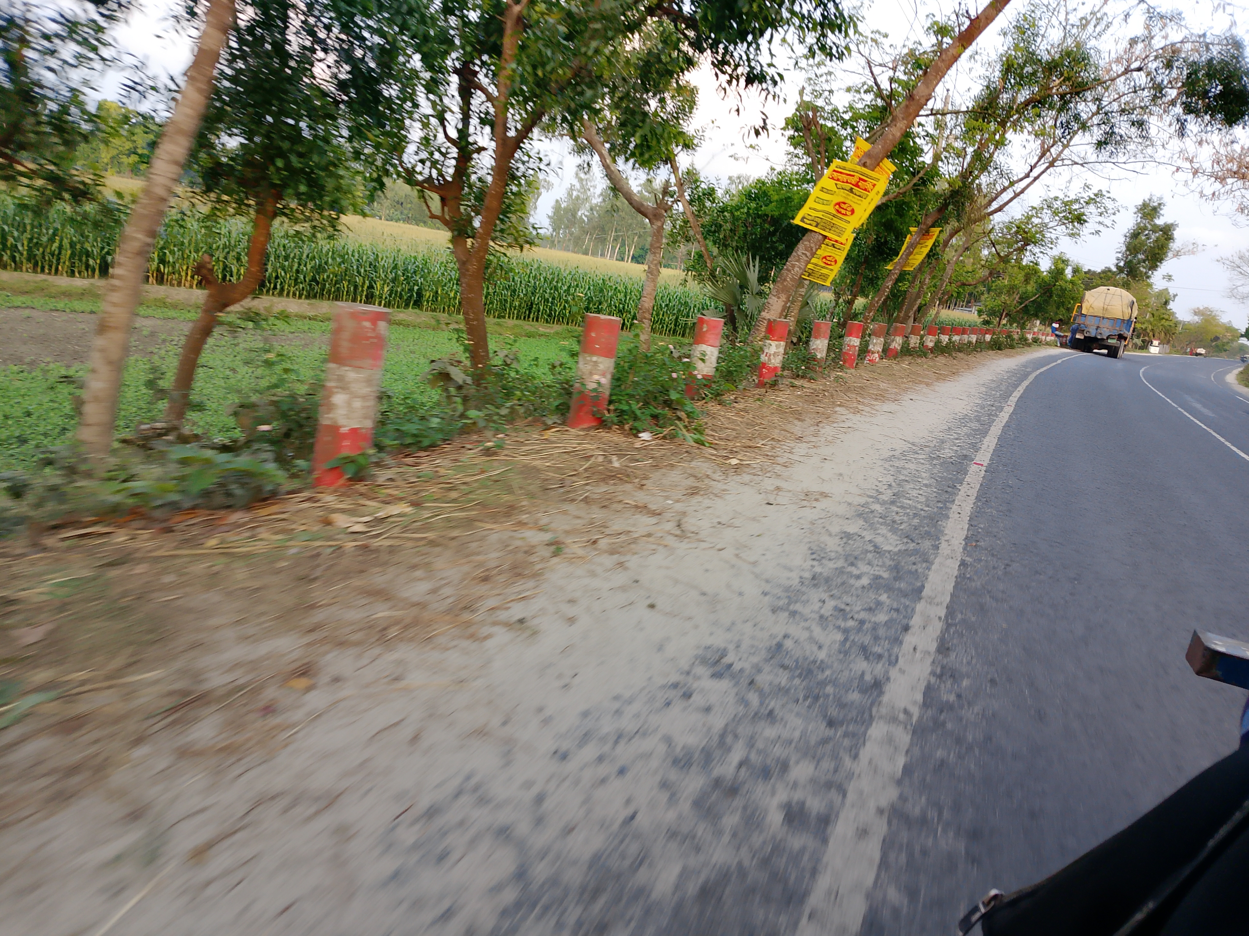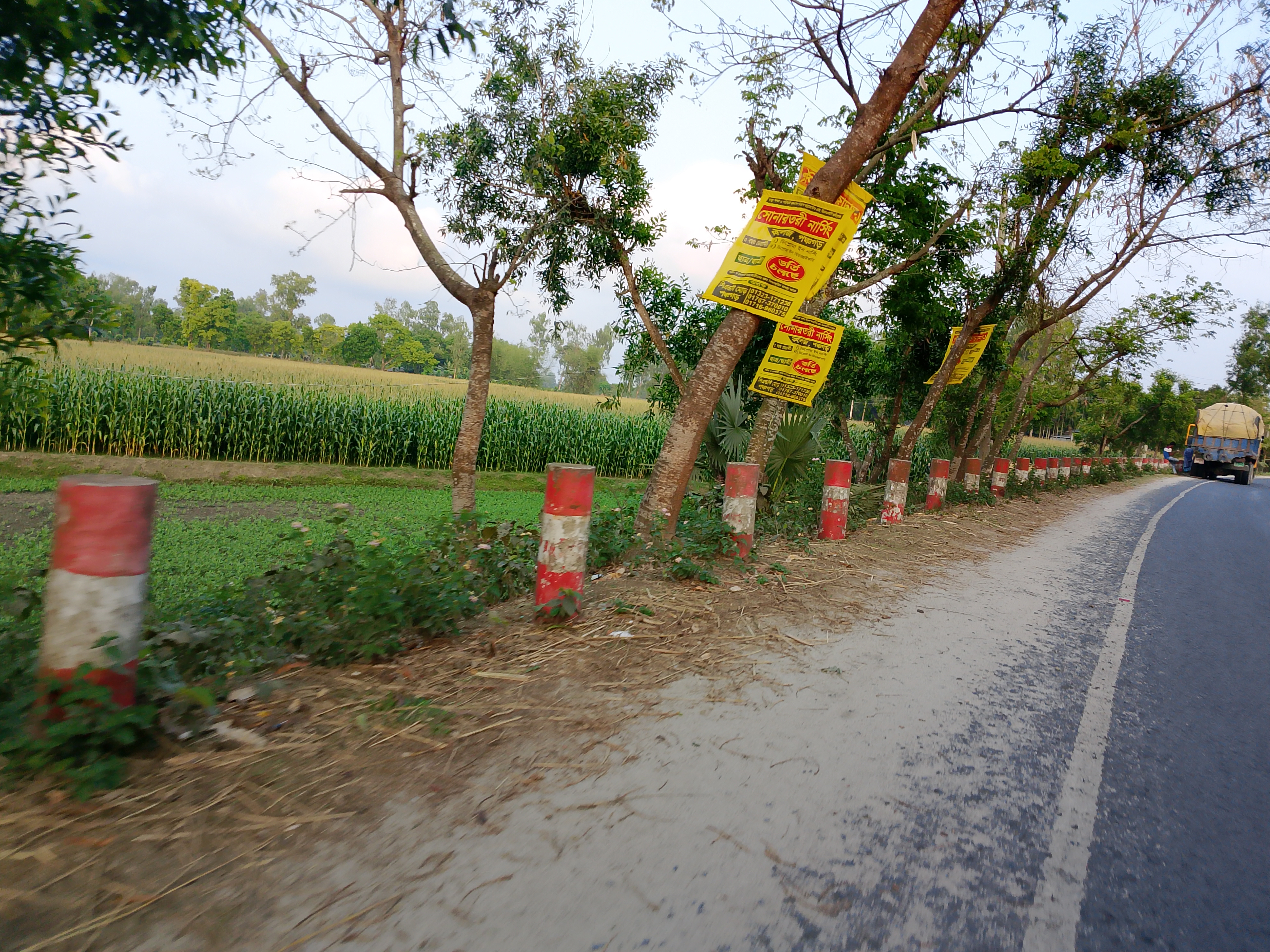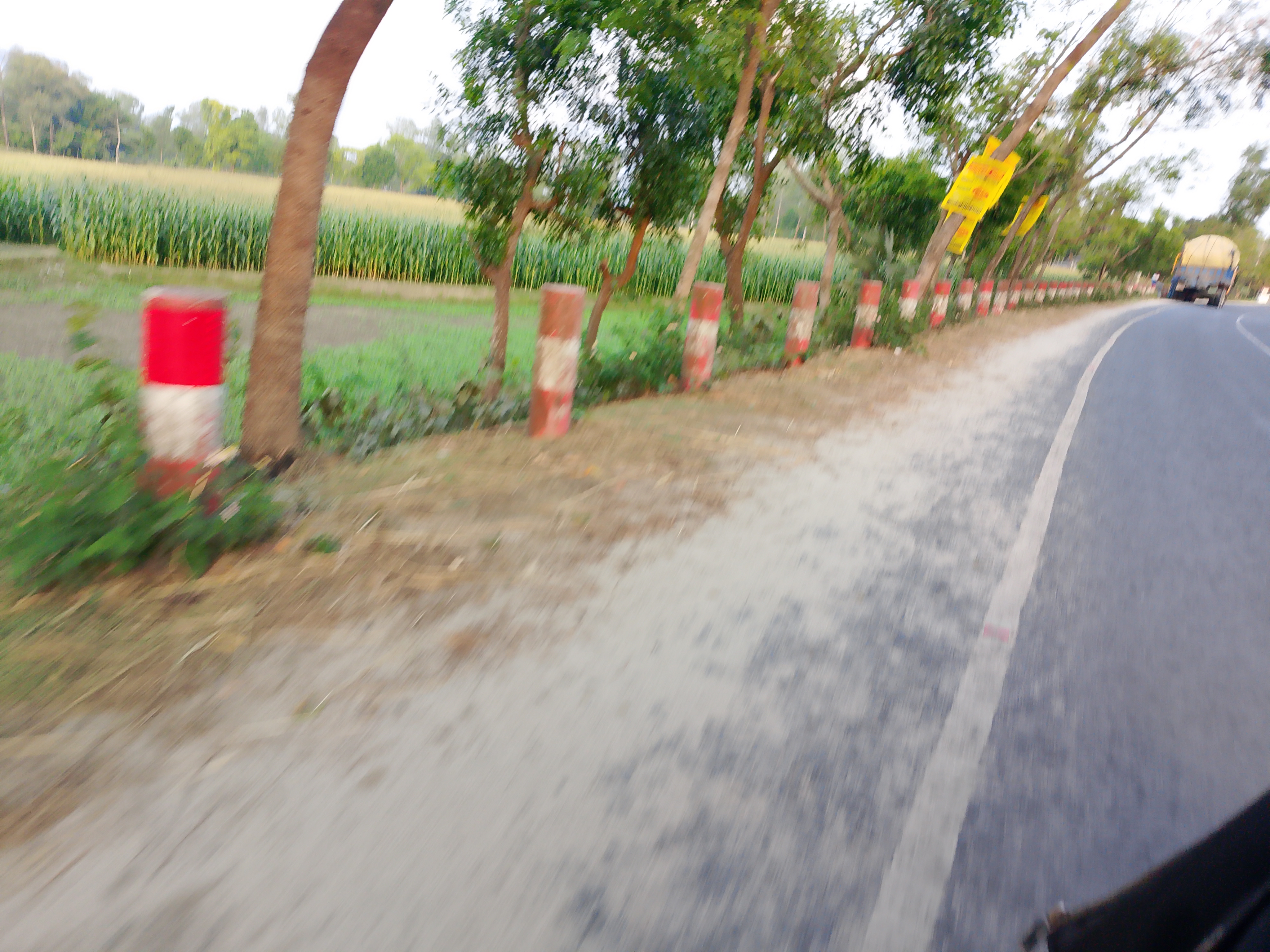 This is a beautiful road, and along its side some red and white pillars have been neatly placed. Because of these, the place looks even more attractive. These have been arranged nicely on both sides of the road. Adding them has made it look much better. The road itself is wide and , and the presence of the pillars beside it makes it look even more appealing.