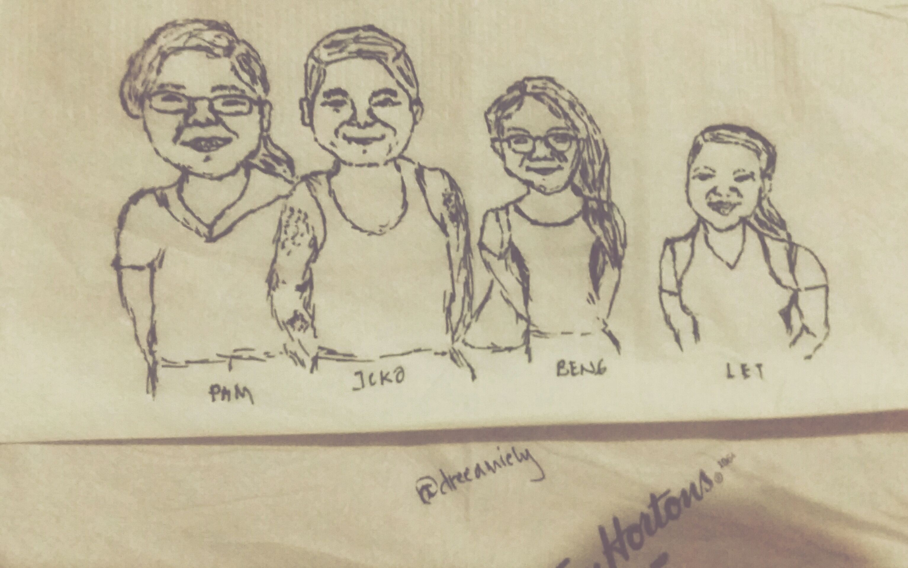 These are the people I spent my Wednesday afternoon with. I am not much of an artist but had fun trying to replicate their image on this piece of paper! I thought of including a likeness of myself, but somehow I am happy to see this as is, as if I was the photographer who captured the image.