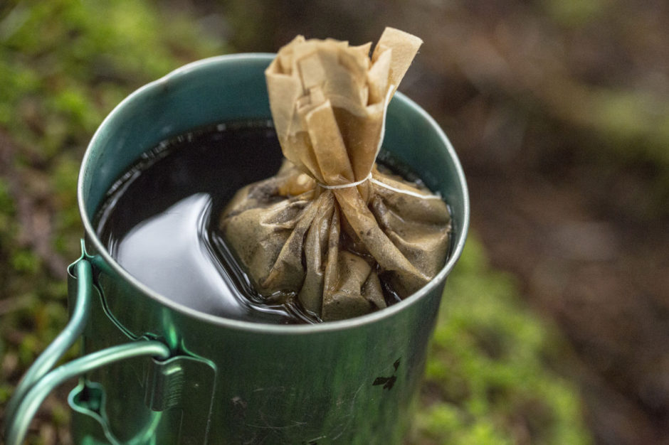 Take the scoop of coffee and put it in the filter, use the dental floss to tie the filter together, making a little ball. You can store this in any container or in your camping tub. Once at the campsite, use the saucepan to get water to a boil. Pour water in to your coffee mug and put the bag of coffee in the water.Bagged Omelettes