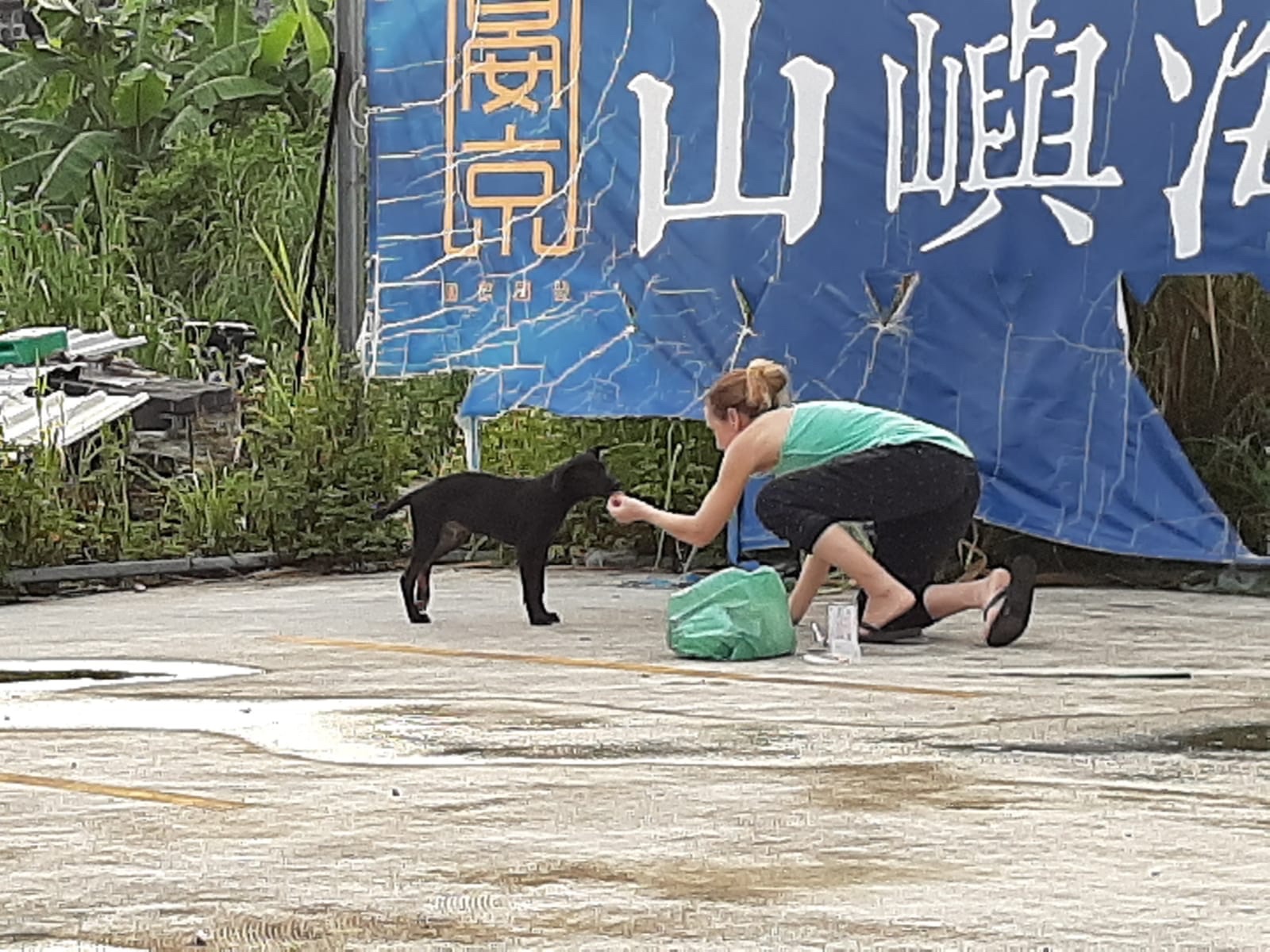 I didn't feed it as the guy had said not to, but I was very relieved that it was there. Then we came back home and I got the stuff ready and I told the kids I'd take them to McDonald's for breakfast and then we could get some nuggets for the dog. We did that and while we were there Greg joined us and then he got a message from the guy who said that he was very sorry, but that he had started out a bit late and that the traffic was terrible and so he would be late. I told him not to worry. Good grief! That he was willing to come all that way for this puppy was amazing to me (it ended up being over a 2-hour drive in that traffic). After a while, I felt the urge to get to the area. I really hoped to catch a glimpse of it just to know it was nearby, but I couldn't find it at all. The guy told me that he was nearby and told me not to scare the dog, just to wait for him. I didn't think that I would scare it, but I think I was just so worried he'd come all this way for nothing. It turns out that I needn't have worried. If we hadn't caught the dog that day, he said he would have left the trap with us and come back for the dog when we had it. Anyway, it wasn't long before a car pulled up. The guy's name was Sean and he was lovely and you could immediately tell how much he loved animals. It turns out that he comes to Yilan County quite a bit. He said there was quite a lot of poaching in the area and people set up illegal snares and that often dogs got caught in them and they would come out to rescue them. He said that they have cameras up now to try and catch the poachers, so he said that while he was here he would go and check that area for illegal traps as well. I told him that I hadn't seen the puppy since that morning and he said not to worry, that judging by how close it got to me, that it would definitely be around. He took out this big cage and we carried it right into the jungle and he left a trail of nugget pieces to entice the dog into the cage. There is a trigger inside it near the food and when the dog steps on it the door closes and it is trapped. I asked him what we would do if the wrong dog went in and he said we must let it out and sort of shout a little to scare it off and then he showed us how to set it up again. At around that time it started raining and then we went back to the main area near the empty building and chatted for a bit. Then both he and Greg had to head out and I said that I would hang out for a little bit with the kids and then go home for a short time to get my external charger (my phone was dying) and then come back again and check the trap, but honestly about 1 minute after they had both left and I was just sitting with the kids under cover, the little guy poked his head out and came walking towards me. I immediately called Sean on the phone and told him that the puppy had made an appearance and that I was busy feeding it tiny pieces of nugget (we hadn't used all of it in the trap) and he said he would turn around immediately. I suggested he park on the other side and come from the back and he said he would do so and asked that I just calmly keep doing what I was doing and to tell the kids to just focus on the phone they were watching on and not look up at him at all. Honestly, it felt touch-and-go because the puppy was nervous and kept walking away a bit and then I would have to coax it back with the food. I told the kids to just look at the phone and not look up and I focused on the puppy and feeding it and letting it smell it and eat out of my hand. Not even three minutes later, I noticed Sean out of the corner of my eye. It was pouring with rain and he was coming up slowly with the net. Very suddenly, it slammed down around the dog and it really panicked at first, but there was nowhere to go. At first the puppy cried and was freaking out and the kids were a bit upset by it, but Sean just explained that the dog was scared and that it would be fine and that we needed to do this to help it.