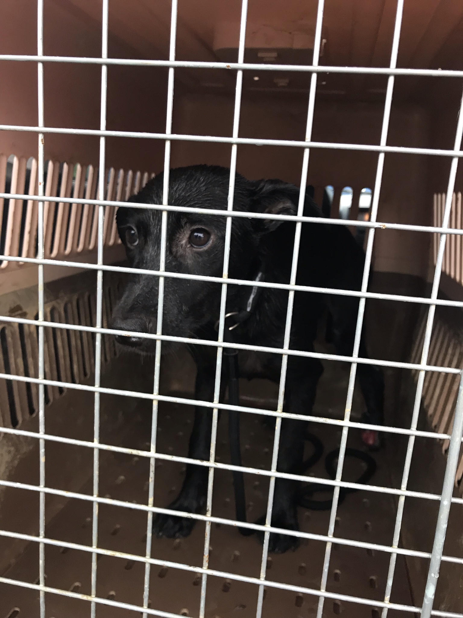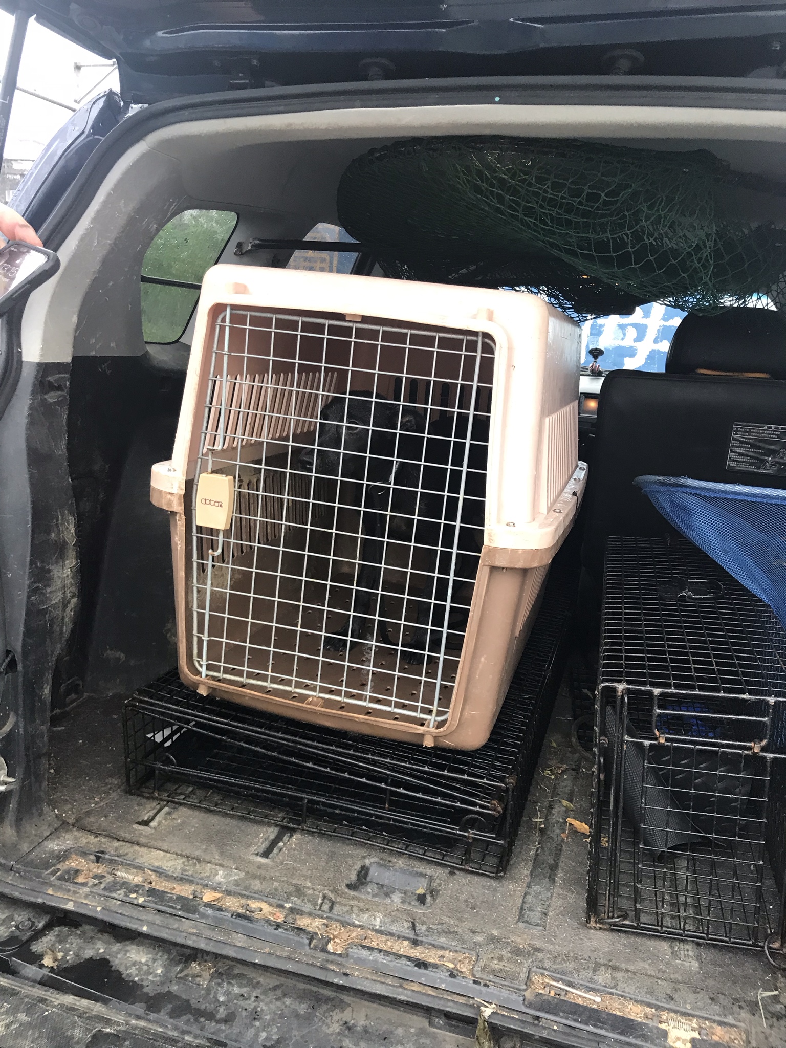Once it was in the net, he got the car and then took out the crate and we unwound the net and he managed to get a leash on the puppy while it was still in the net and then he looped it through the cage and I held it and he pushed it and it really didn't have anywhere to go, but into the crate. Then he closed it and it was done. In the end, you could tell it was scared, but had calmed down. Sean was very chuffed and said that he wished all rescues were so quick and easy. He said that I had done an excellent job and had been completely natural and hadn't looked up at him at all and so it had worked like a charm. Then we went and got the cage (humane trap) and folded it up and left the chicken for the other two dogs and put the cage in the car and then loaded in the puppy. He said that he would head straight to the vet and that he really hoped that they could save the leg.