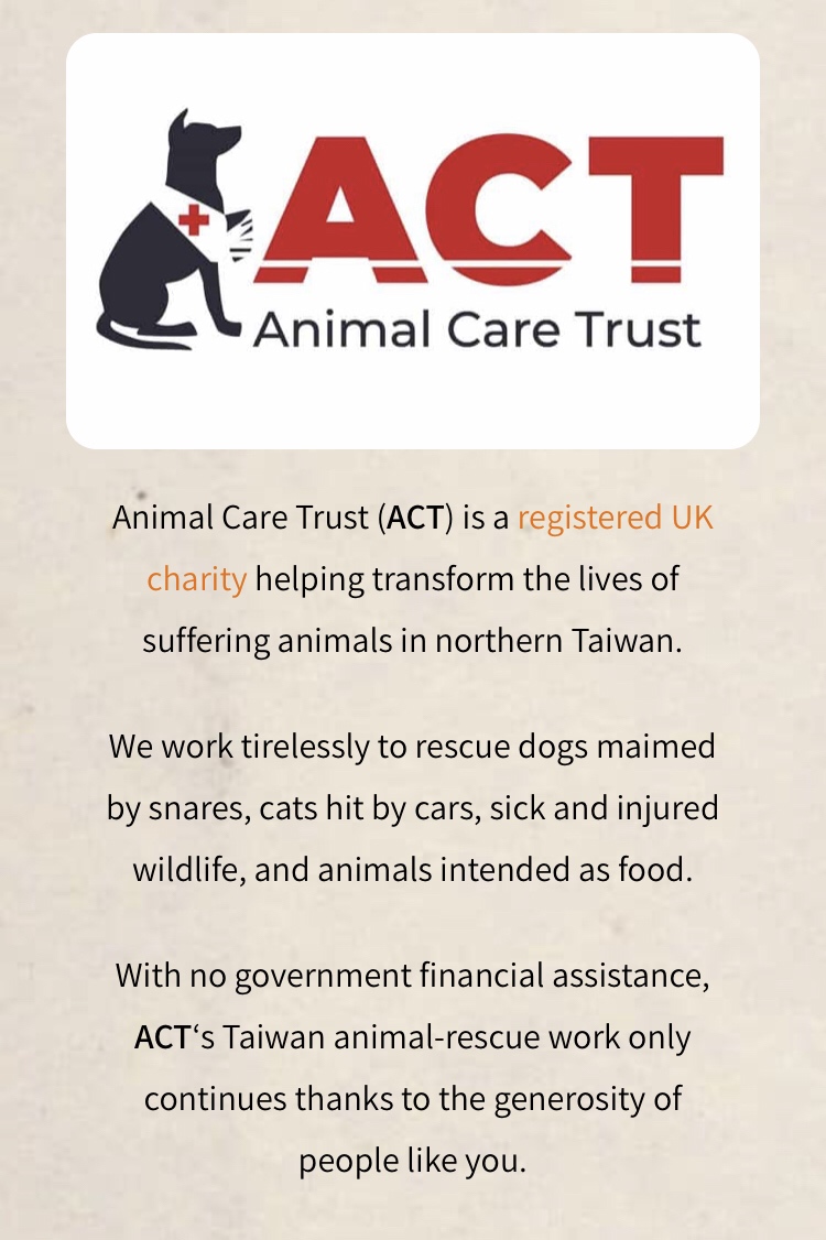 The pills were set to run out on Saturday, but on Friday my friend said that the vet was coming through again and would bring more pills. However, that night she called me and said that she felt terrible but she had forgotten about it and the vet had left without giving them to her. She asked if I could go into Yilan City the next day and get some, but I was meeting someone the next day in Taipei and Greg was going to be somewhere else further north. I told her that I would look for a vet in Taipei. She had to work that day and her job is also in Taipei and she also said that she would try and find a vet. I wasn't able to find one. The area I was in was very fancy and built up with tons of high rises and I didn't even see one dog, never mind a veterinarian. That night when I got home I wanted to go to the local vet, but then my friend called and said she was outside a vet in Taipei and wanted to know if I'd been successful. I told her that I had not been successful and she said that I mustn't go to the vet, that she would go. However, later on after I had already gone and fed the puppy (with Greg and the kids because it was dark and I didn't want to go alone) she called and was quite upset because the vet had refused to give any medicine to her. I told her that I had been to a pharmacy earlier and the pharmacist was very kind and when I showed him the photos of the dog he said that he could sell me amoxicillin, but the pills were too big and I knew there was no way the puppy would take them. I told her that if push came to shove, I would buy those pills and use some empty capsule shells I had to halve them. The pharmacist told me that I needed to wrap the puppy's leg, but I told him that I really couldn't get near to the leg. It barely trusted me enough to take food from me, there was no way I could ever have wrapped the leg up. I felt so sad that night and told Greg that I really wanted to contact people on Facebook and ask them what to do because that is one thing about Facebook that I miss (I no longer have an account) - the people who loved animals really did rally around each other in these kinds of circumstances. I said that I didn't know what else to do, that I felt like the puppy was in pain and suffering and that I wasn't doing enough. Greg still has a Facebook account and he said that there must surely be other groups that care. He started searching on Facebook and although we could find none in our area, there were a few in Taipei. I don't know what made him click on the one he did, but he showed me that you could send them a message and that there was even a number to call for emergencies. It was a registered UK charity called "ACT - Animal Care Trust" and their motto is "Rescue, Transform, Love for life". I wrote a message (via FB) and just made it sound like it was Greg writing on my behalf. I also chose 4 photos that showed the puppy and the wound. I cannot describe the feeling and how my heart soared when not even 10 minutes later there was a message saying, "I can come through tomorrow. What time do you usually feed it?" Someone was willing to help me!!!! I said that I usually fed it at 11am and he said it would be better if the puppy was hungry. I said that I could get close enough to feed it, but that it was very scared and I couldn't get closer than that or make any sudden moves. He replied and said not to worry, that they had humane traps and nets and would catch it easily enough.