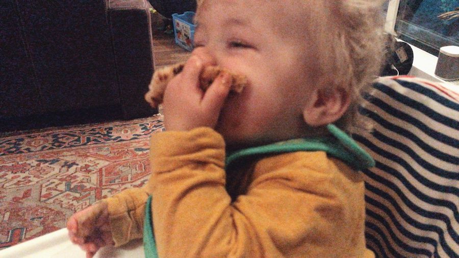 That was fun. He can now feed himself and he stuffed the sandwich in his mouth at blazing speed.
