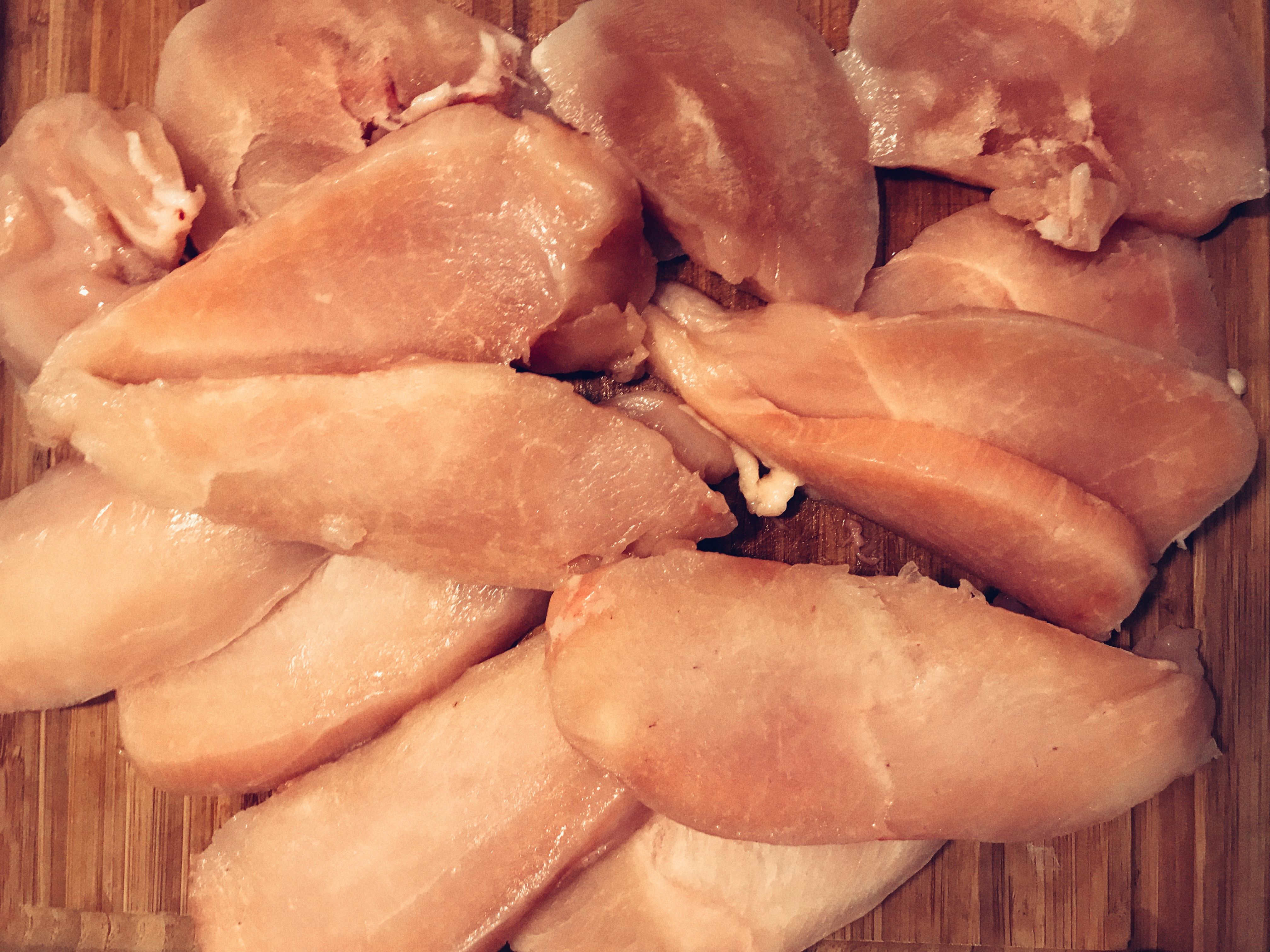 Slice the chicken in thick strips.