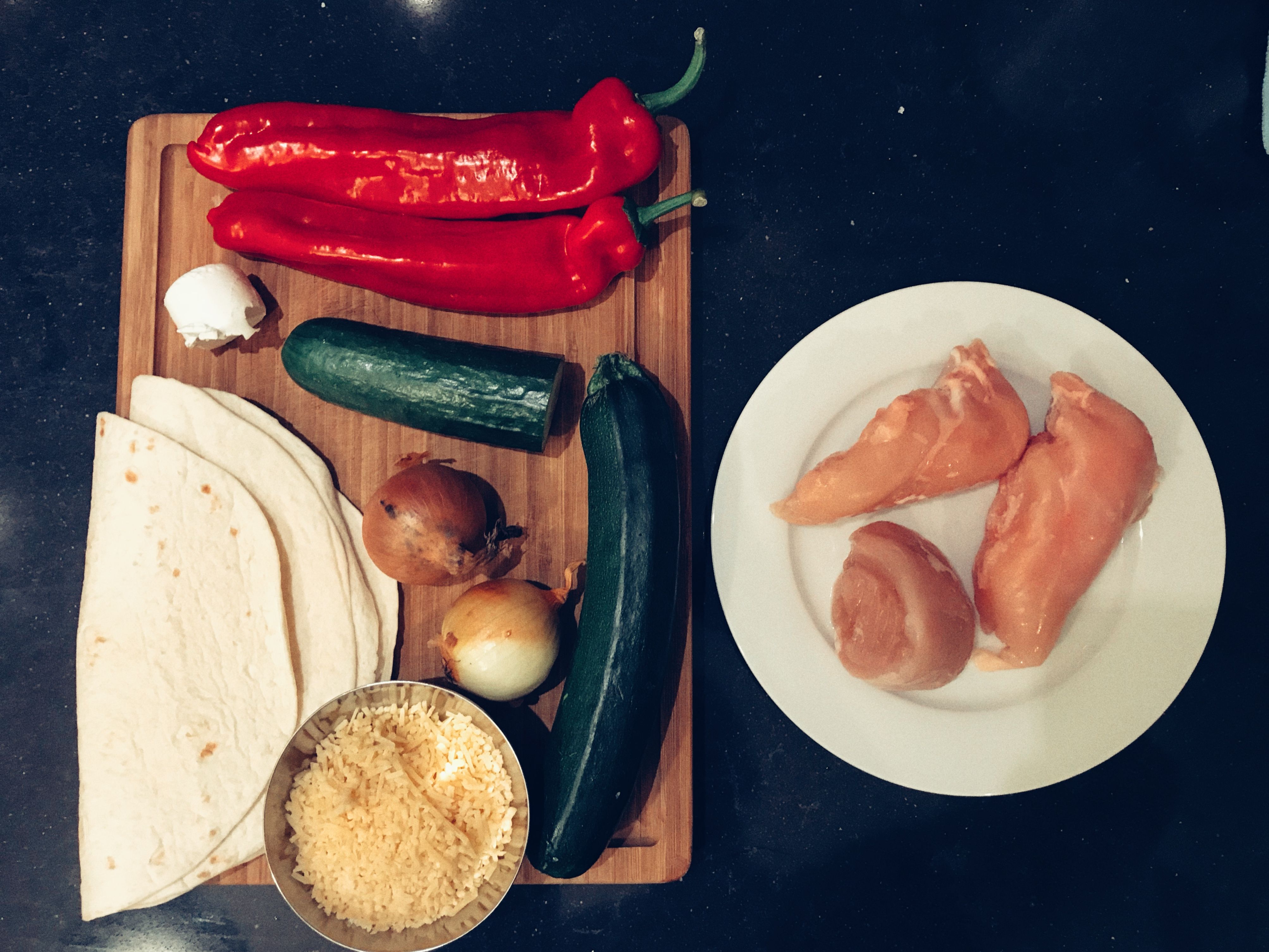 Ingredients: Chicken Breasts, red peppers, wraps, cheese, goat cheese, 2 onions, cucumber and a zucchini.