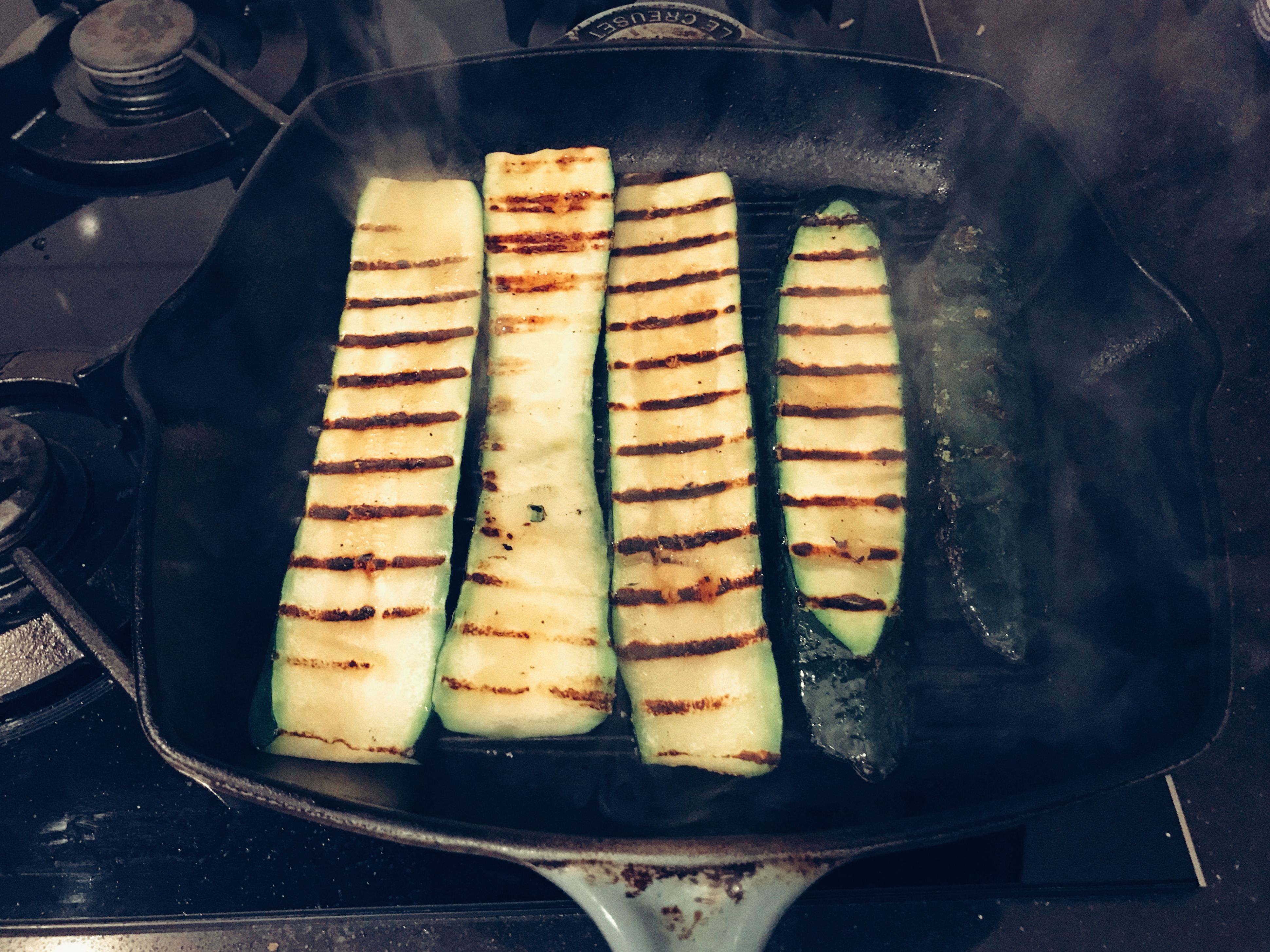 Grab a grill pan and make sure it's blazing hot. I warmed mine up for 10 minutes before using it (it's cast iron). Don't add any oil to a grill pan ever! I started with the zucchini. I grilled it for about 3-4 per side.