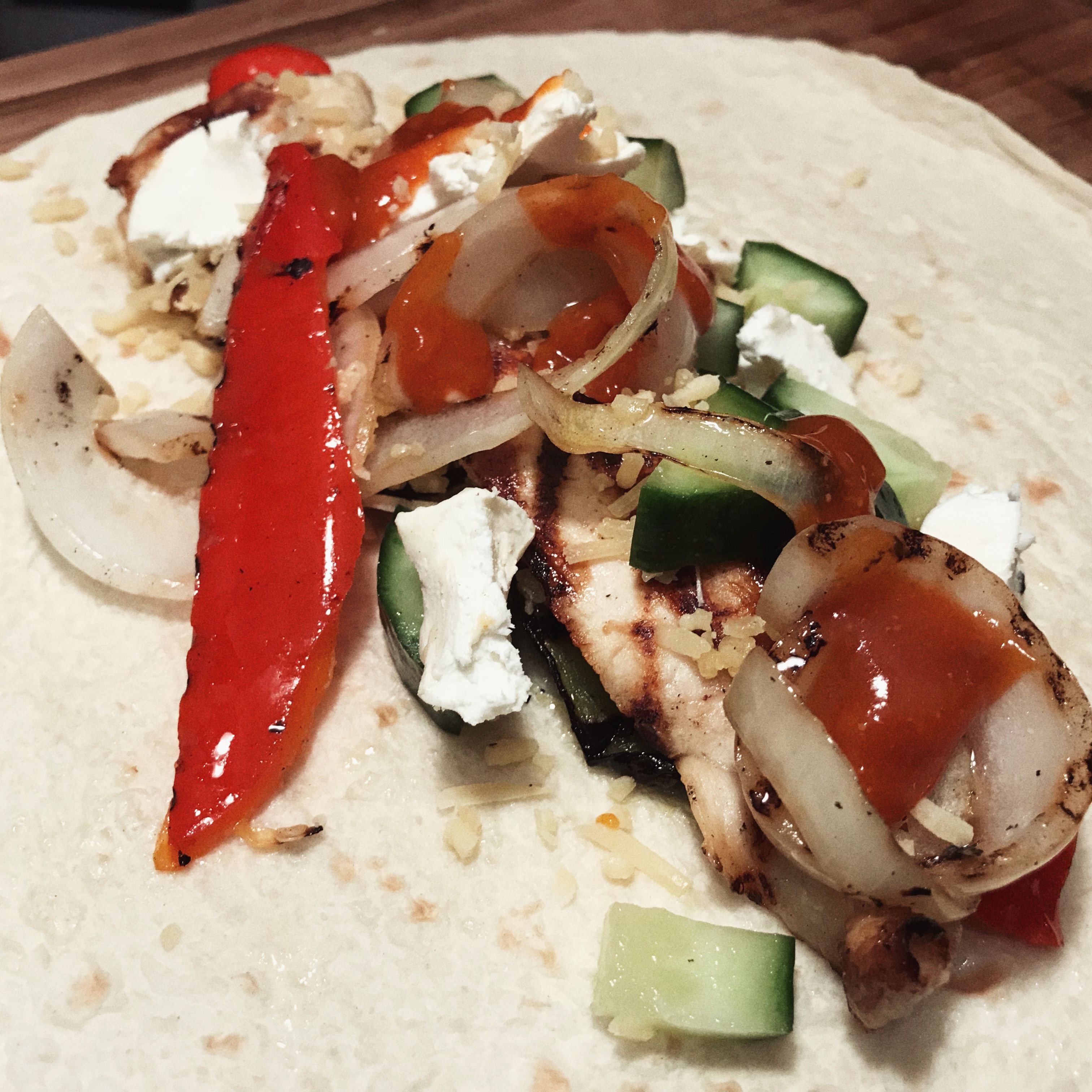 I decided to make a wrap with Grilled chicken, grilled peppers, zucchini and onions, goat cheese and a Moroccan sauce.