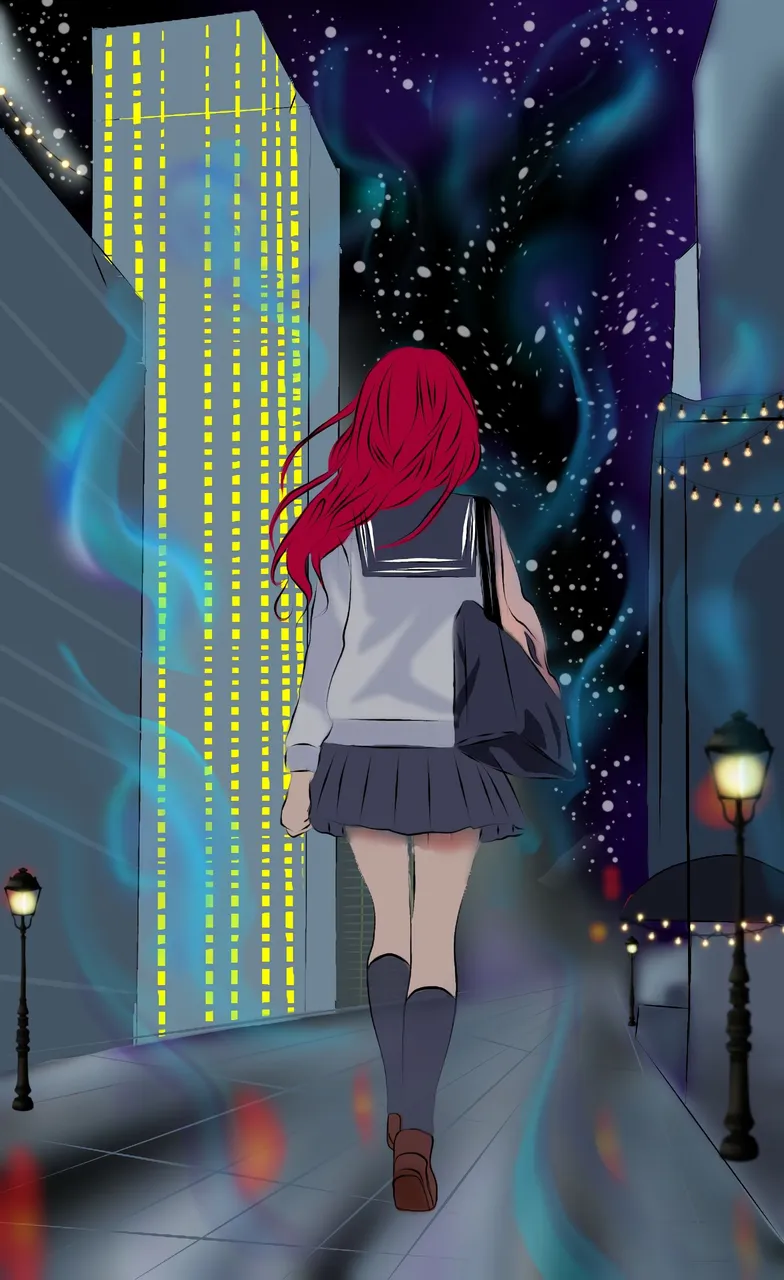 In this image, the young figure with fiery hair walks down a familiar street, enveloped in the warm, steady light of the buildings. It is a path we all know: that of routine, responsibilities, the structured life that is built brick by brick, window by window. But above her, and beginning to invade her space, there is not a simple night sky, but a cosmic web of nebulae and shooting stars, a portal to immensity, to that which escapes logic and measurement.
