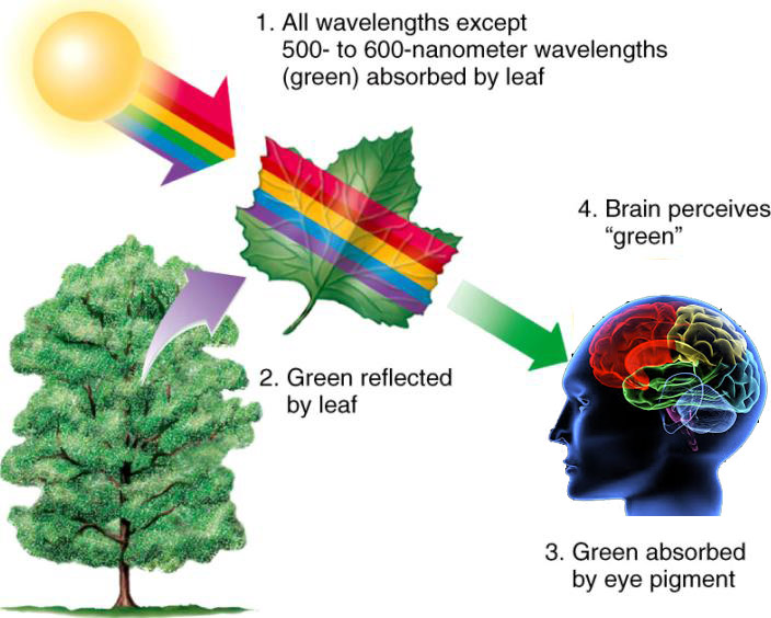 We can prove this in the following way. When we expose a plant to only blue and red light, we can not see the plant green. Because this light is reflected by the plant in a very small amount of wavelengths. But since the green wavelength region in white light is reflected much more than all other wavelengths, the plant appears green.